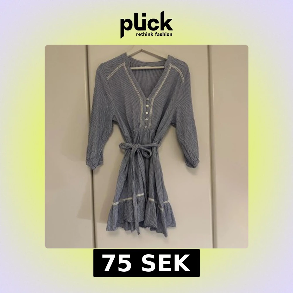 Superfin blåvit randig klänning från Zara med trekvartsärm, v-ringning och knappar framtill. Klänningen har knytband i midjan och volang nertill för en extra söt look. Perfekt för varma dagar och enkel att styla med sneakers eller sandaler.