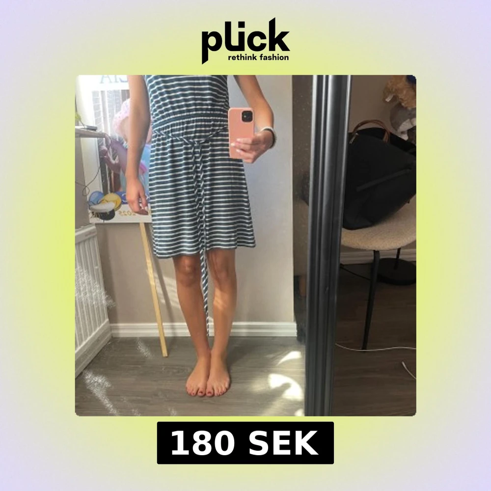 Superfin kortklänning i blått och vitt med horisontella ränder och knytband i midjan. Klänningen har korta ärmar och rund halsringning, perfekt för varma dagar. Mjuk och skön känsla, passar dig som gillar en avslappnad men ändå söt stil.