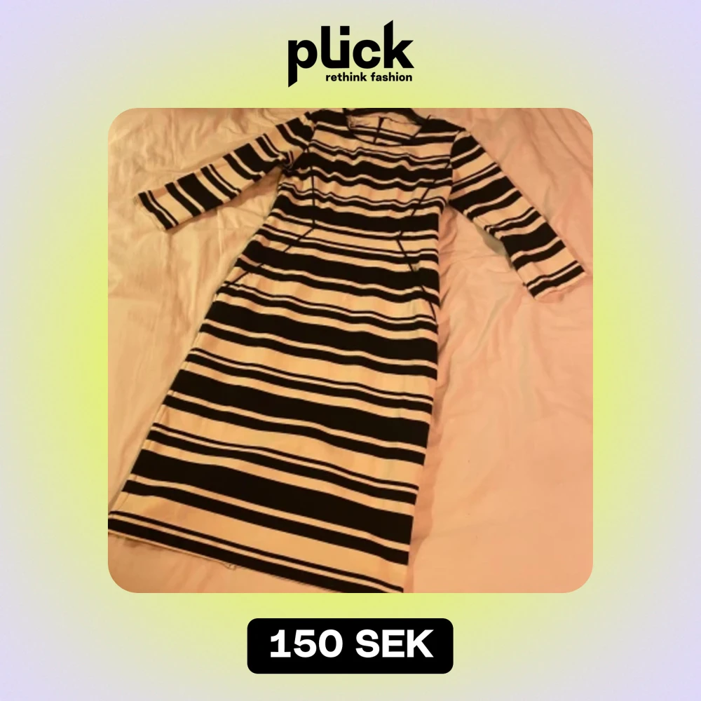 Säljer en superfin randig klänning från Part Two i storlek S. Klänningen är svart och vit med ett snyggt randigt mönster. Den är tillverkad av 66% viskos, 30% polyamid och 4% elastan, vilket gör den både bekväm och stretchig. Klänningen har trekvartsärmar och en normal passform. Perfekt för både vardag och fest!