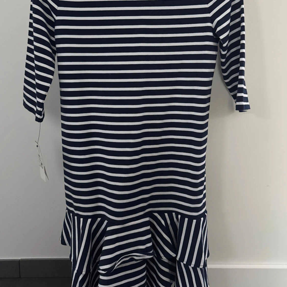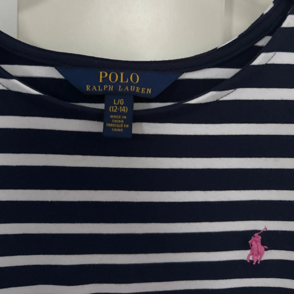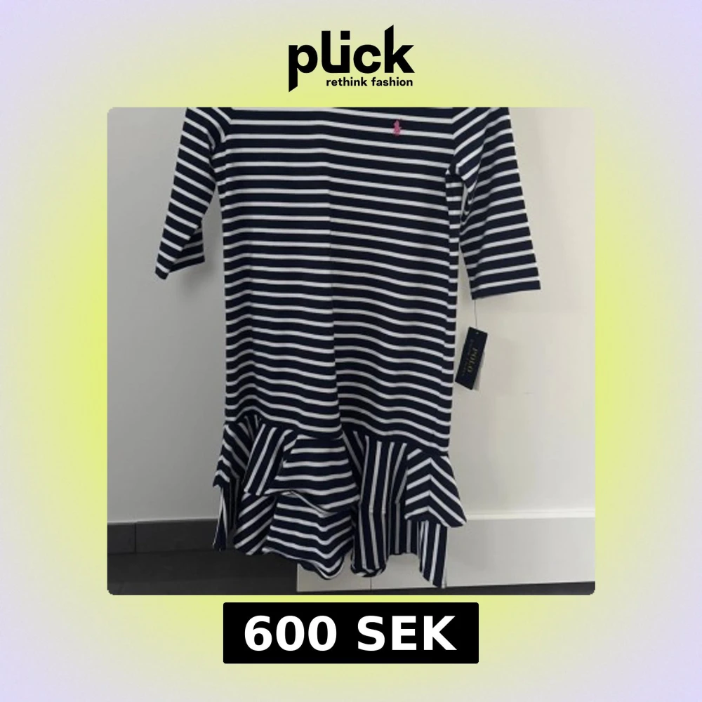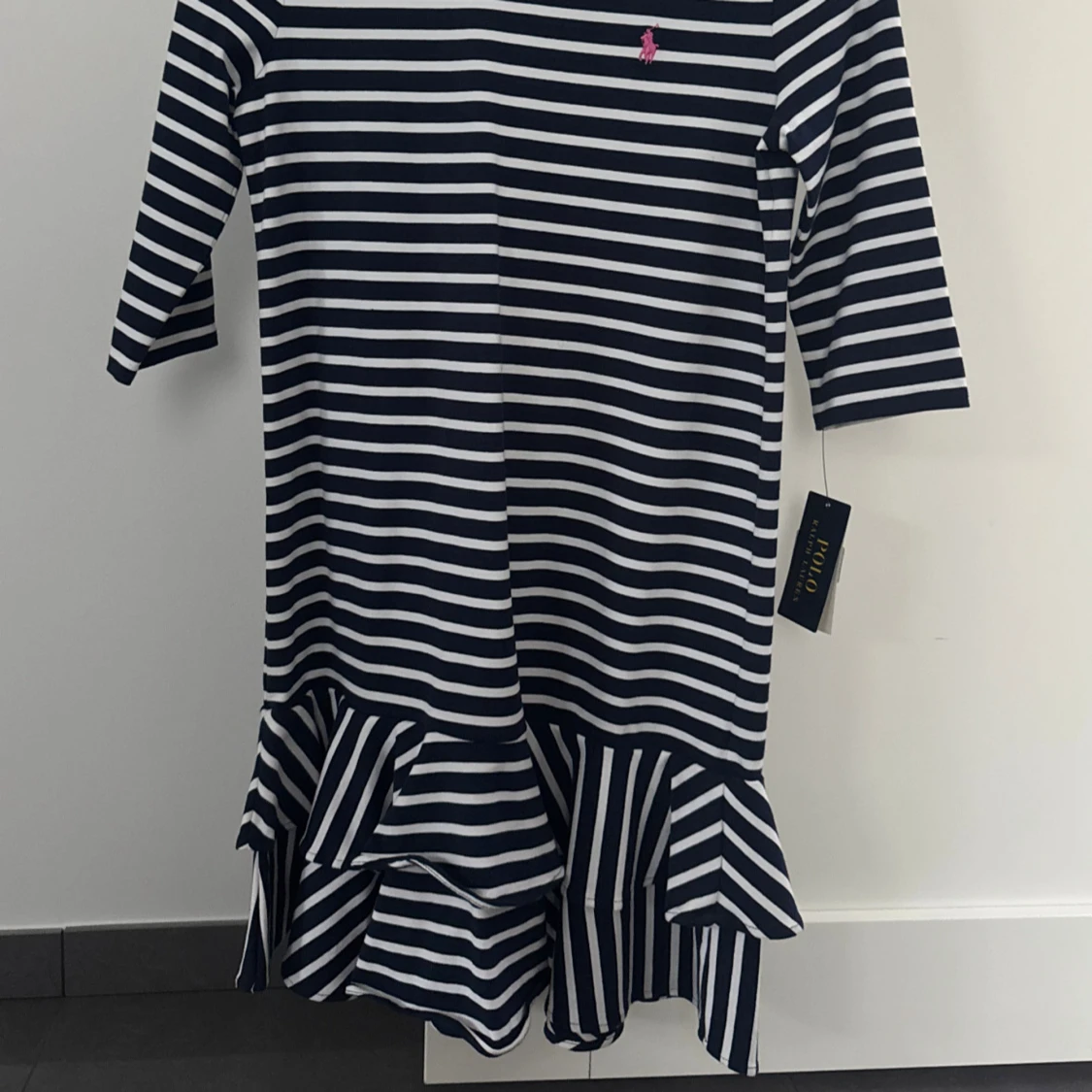 Snygg randig klänning från Polo Ralph Lauren i marinblått och vitt med rosa logga på bröstet. Modellen har trekvartsärm och volangdetalj nedtill som ger en cool touch.
