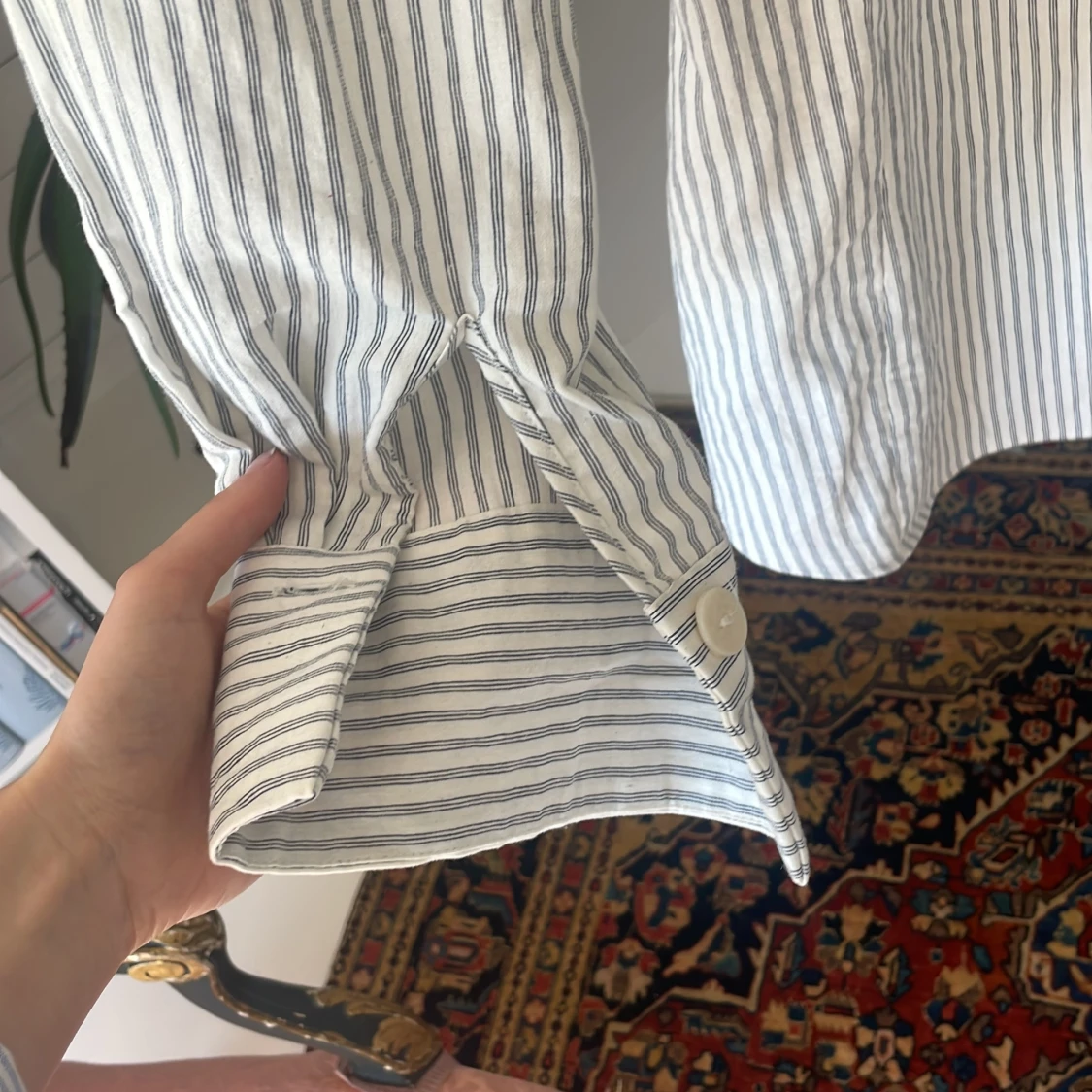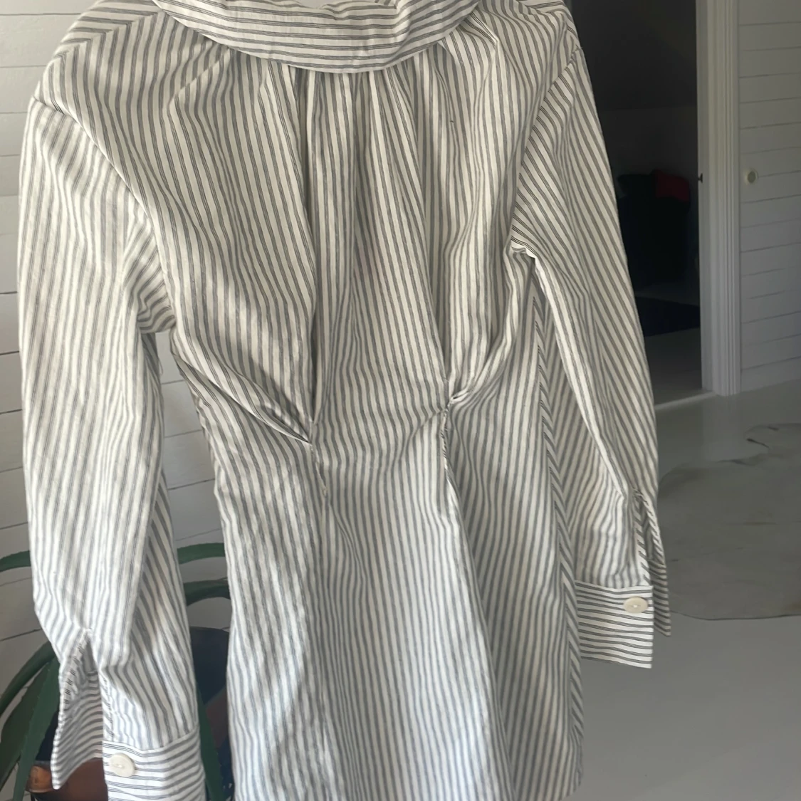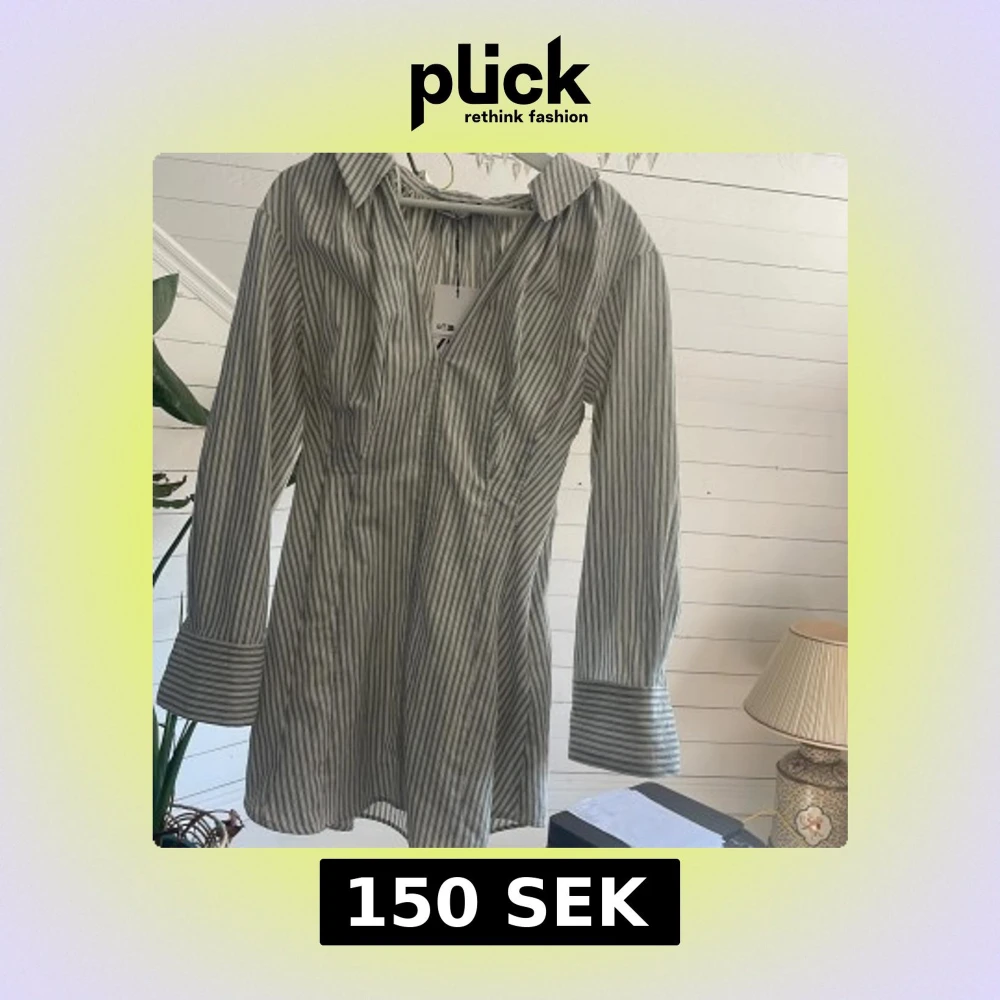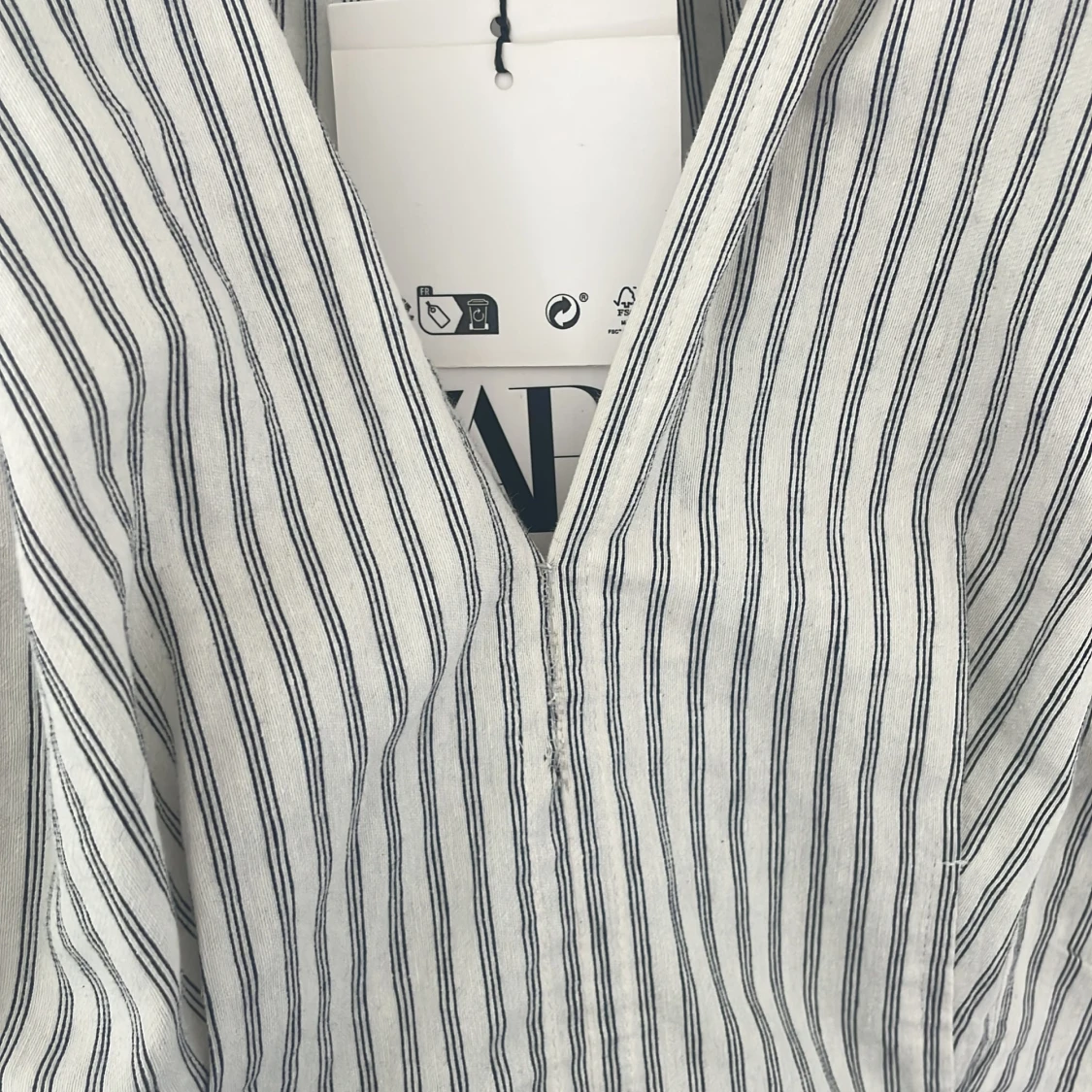 Snygg skjortklänning från Zara i vitt med smala svarta ränder. Klänningen har långa ärmar med bred manschett och knappar, klassisk krage och v-ringning. Har sytt in v-ringningen lite så att det inte går lika djupt