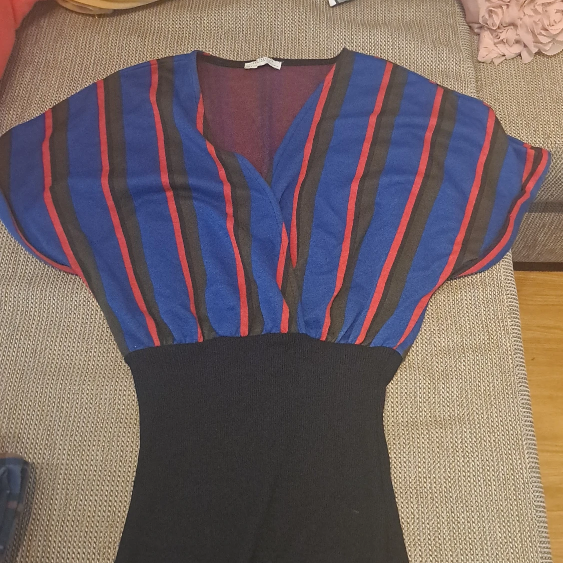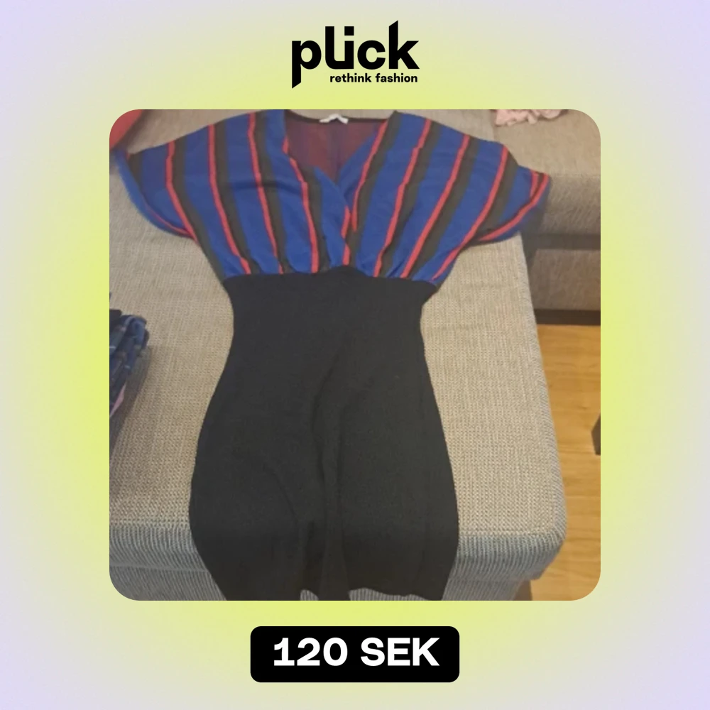 Säljer en snygg klänning med randigt mönster i blått, rött och svart. Klänningen har en v-ringad överdel med korta ärmar och en tight passform i midjan som ger en fin siluett. Perfekt för både vardag och fest! oanvänd. 100% nytt.