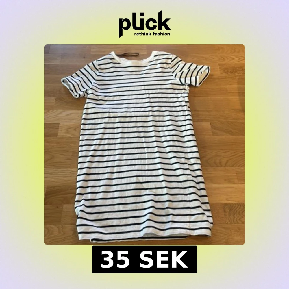 Säljer en vit och svart randig klänning med korta ärmar. Perfekt för en avslappnad stil. Klänningen har en enkel och klassisk design som passar till många tillfällen.