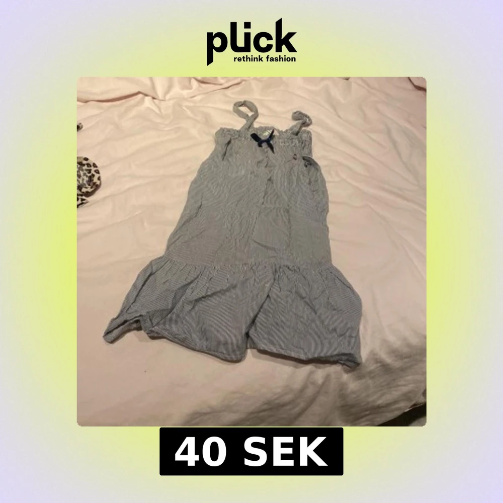 Supersöt klänning med smala blå och vita ränder, volangkant nertill och en liten blå rosett framtill. Perfekta för varma dagar och har en luftig, loose passform. Axelbanden ger en unik look och materialet känns lätt och bekvämt.