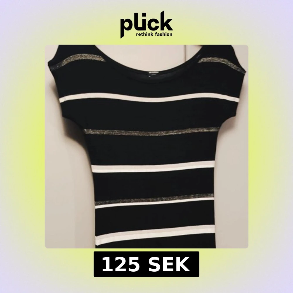 Svart långklänning med vita och glittriga silverfärgade horisontella ränder. Klänningen har rund hals och korta ärmar, figurnära passform och är gjord i mjukt syntetmaterial. Perfekt för dig som gillar stilrena och trendiga mönster. Nyskick.