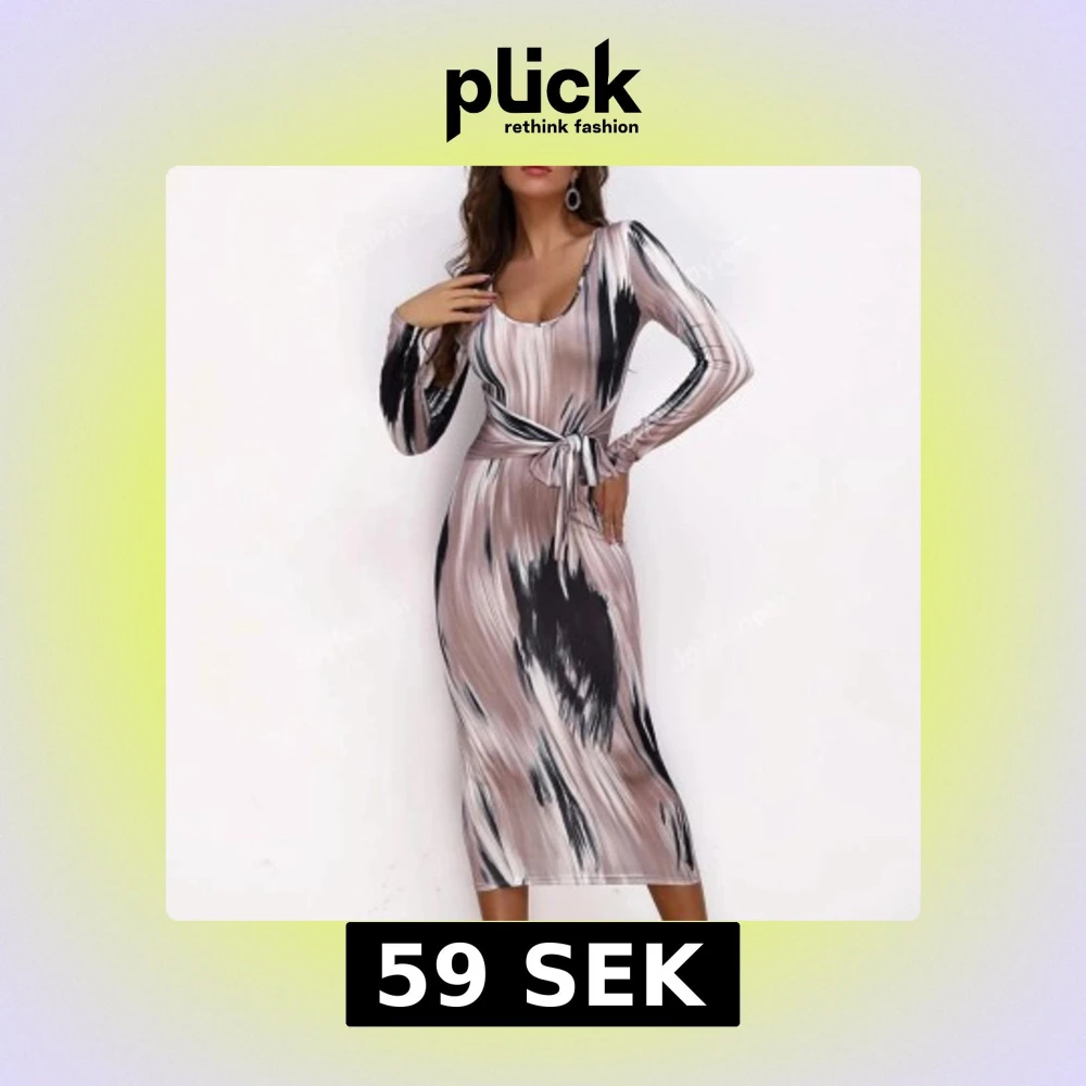 Snygg långklänning med coolt randigt mönster i beige, svart och vit. Klänningen har långärmade ärmar, rundad halsringning och ett knyt i midjan som ger en smickrande siluett. Materialet är mjukt och följsamt