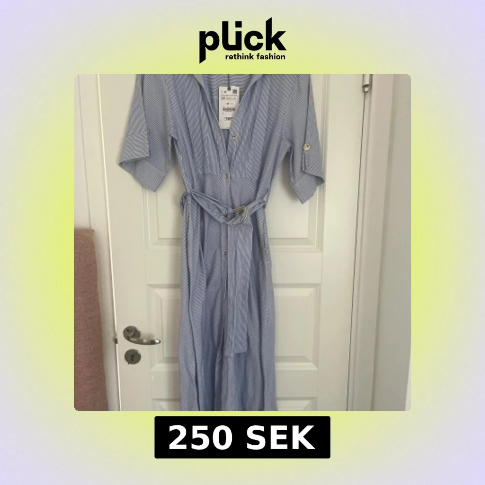 Snygg blåvit midi-klänning från Zara med tunna vertikala ränder, knappar framtill och matchande bälte i midjan. Klänningen har krage, korta ärmar med knappdetalj och är perfekt för en fräsch sommarlook.