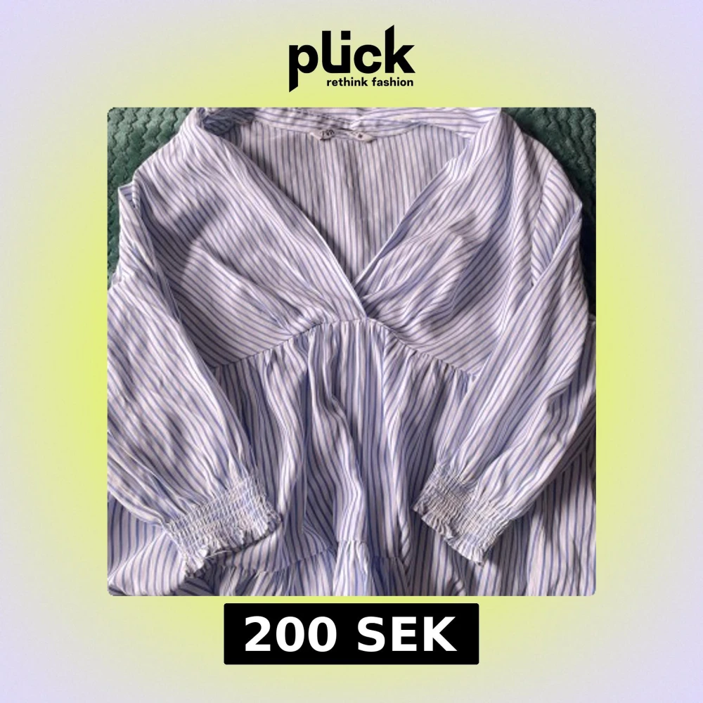 Superfin kort omlottklänning från Zara i vitt och ljusblått med smala ränder. Klänningen har v-ringning, långa ärmar med smock vid handlederna och volangig kjol. Perfekt för sommarens alla tillfällen!