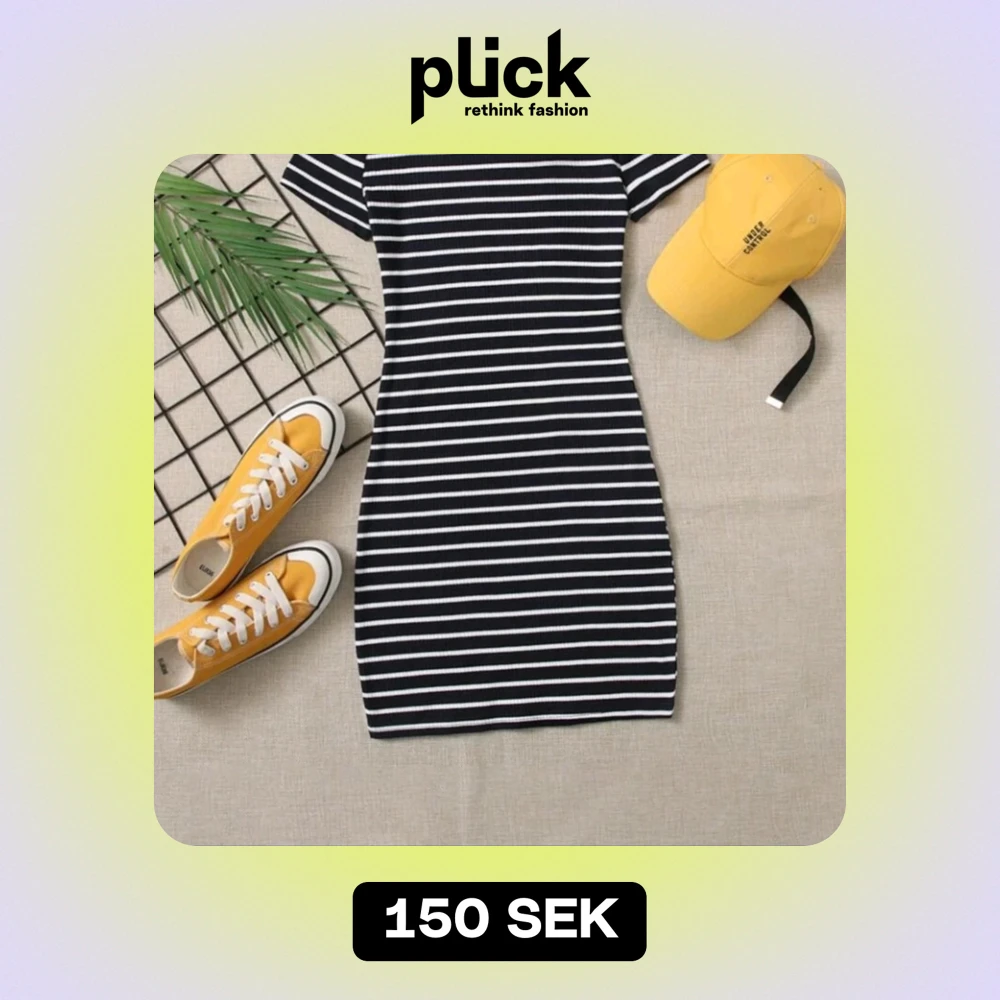 Säljer en superfin randig klänning i svart och vit. Den är ribbad och har en tight passform som framhäver figuren. Perfekt för både vardag och fest! Klänningen är kortärmad och gjord i ett mjukt material som känns skönt mot huden.