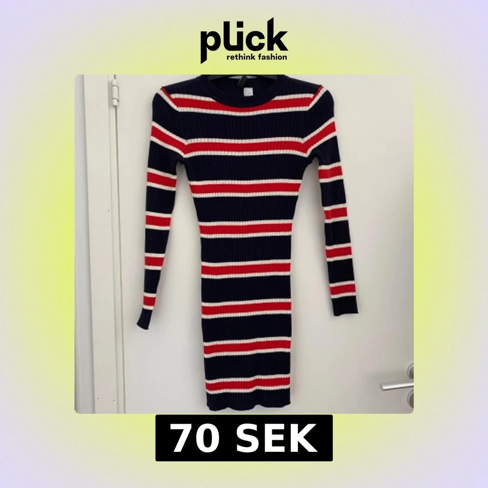 Snygg oanvänd ribbad klänning från H&M Divided i marinblått med röda och vita ränder. Klänningen har lång ärm, rund halsringning och figurnära passform. Hör av dig vid frågor! Köparen står för frakten.