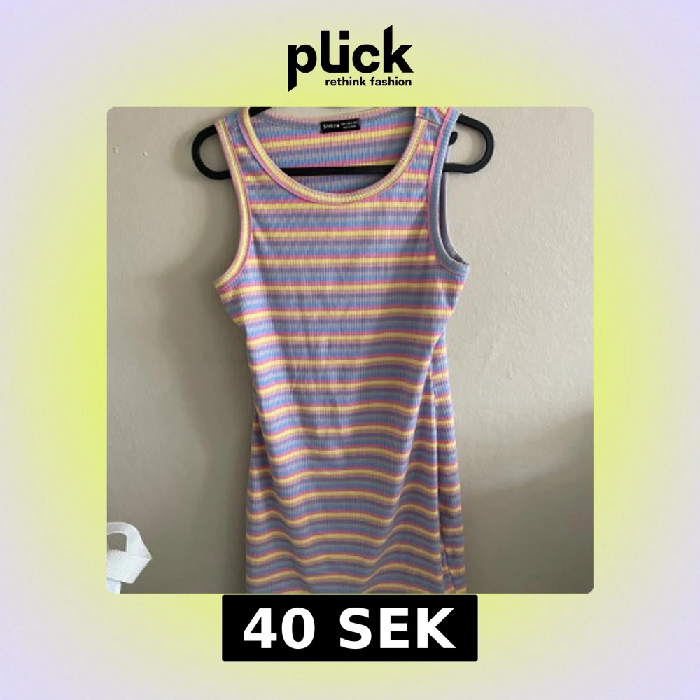 Säljer en ärmlös ribbad klänning från Shein med färgglada ränder i lila, gul, rosa och blå. Klänningen har en rund halsringning och är i en mjuk, stretchig bomullsblandning. Perfekt för varma dagar!