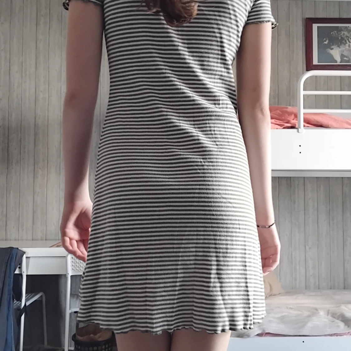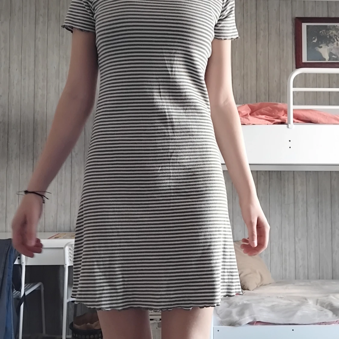 Superfin ribbad klänning med smala gröna och vita ränder. Modellen är kortärmad och har en rak, något figurnära passform. Mjuk och stretchig bomullskvalitet som är skön att ha på sig. Perfekt för dig som gillar en enkel men snygg stil.