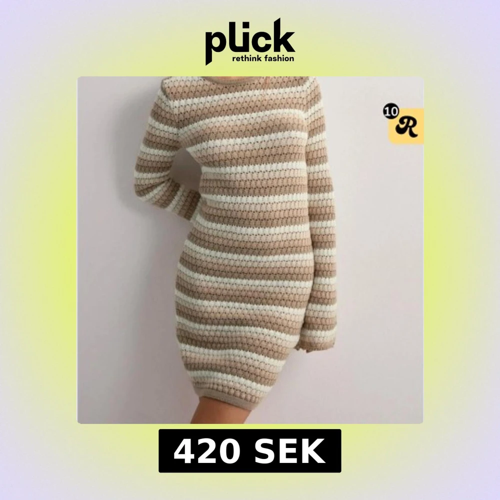 Supermysig stickad klänning med beige och vita ränder. Modellen är kort med långärmade ärmar och har en slim passform som sitter snyggt på kroppen. Perfekt för dig som gillar en chill och trendig look. Materialet är stickat och känns mjukt mot huden.