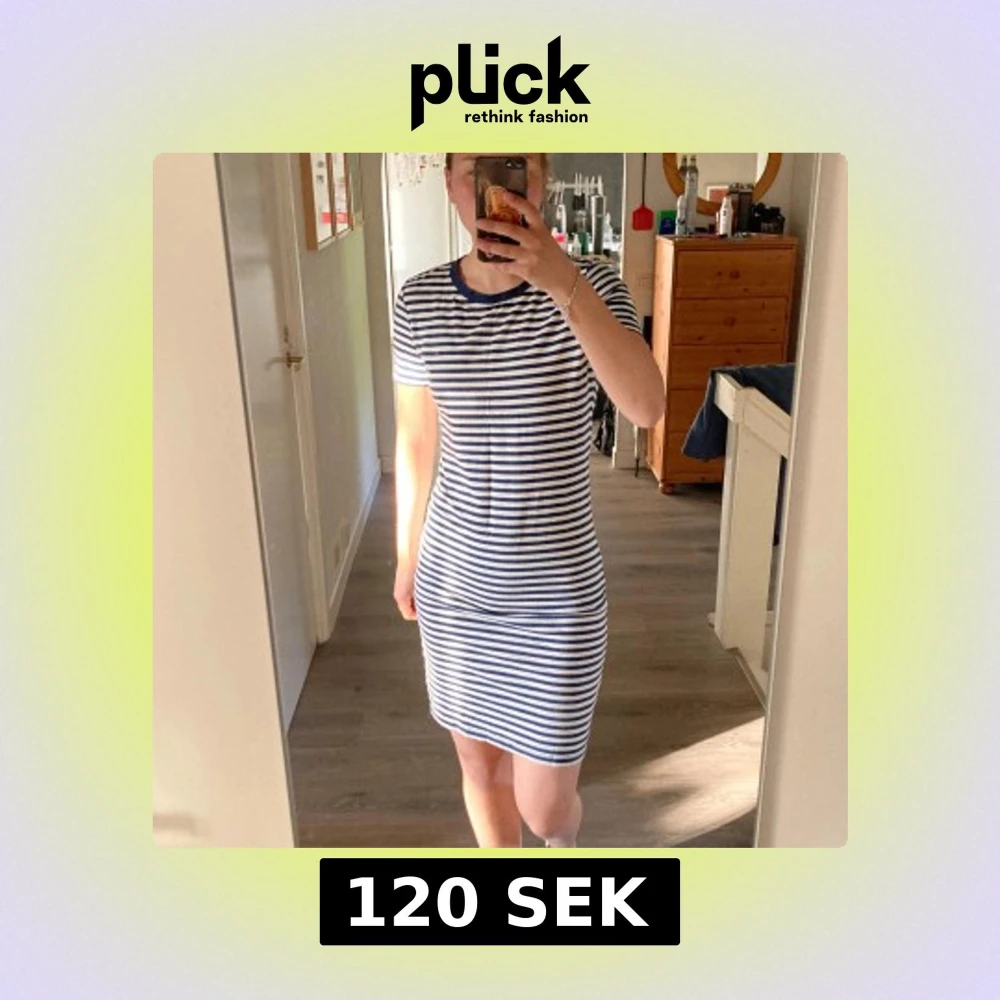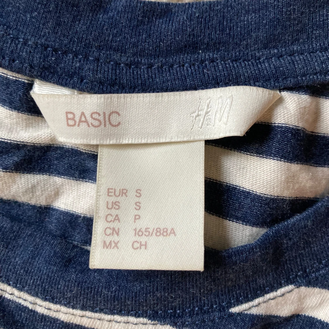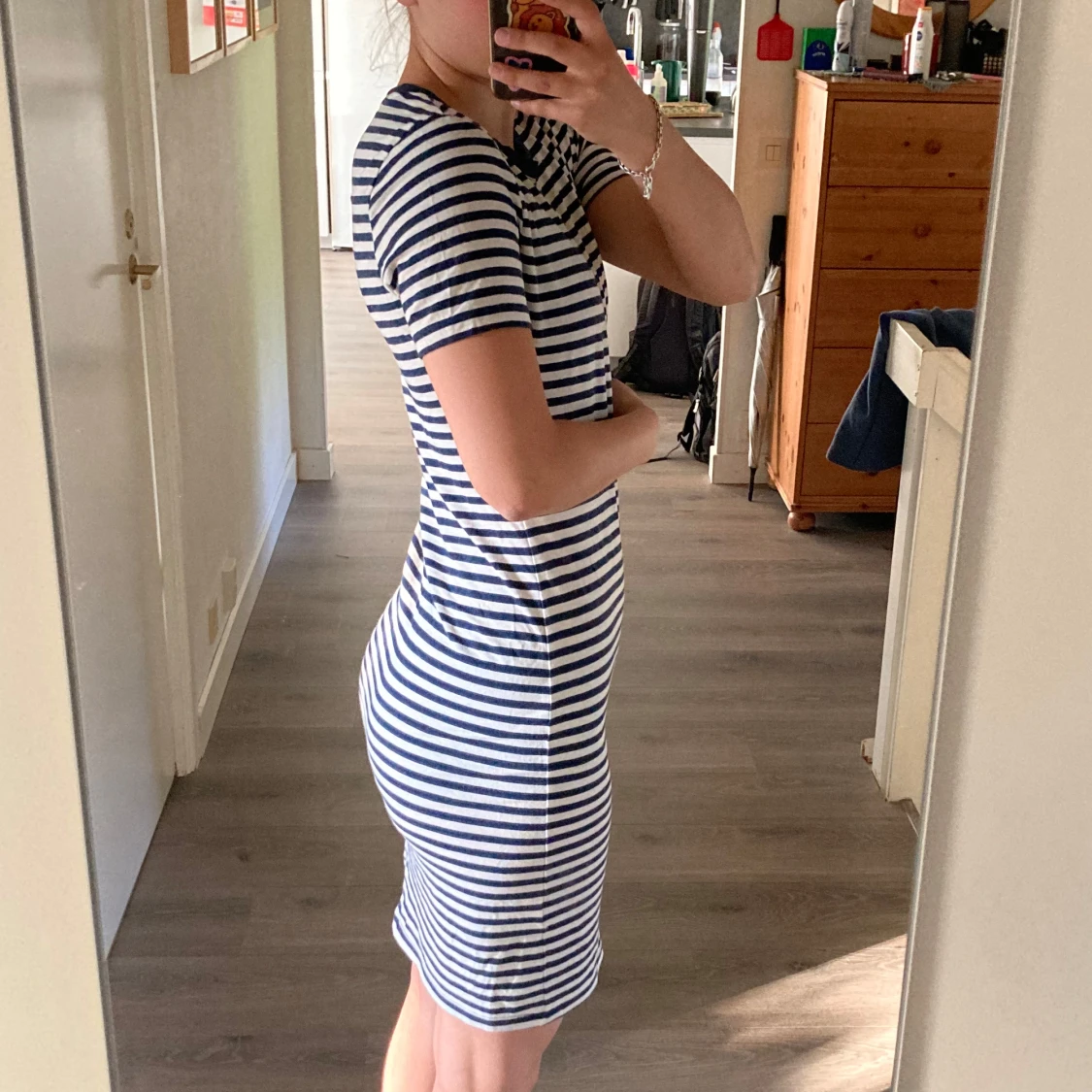 Säljer en klassisk t-shirtklänning från H&M i marinblått och vitt. Klänningen har rund halsringning, korta ärmar och är i mjuk bomull. Den har en tight passform och randigt mönster som ger en fräsch och enkel look.