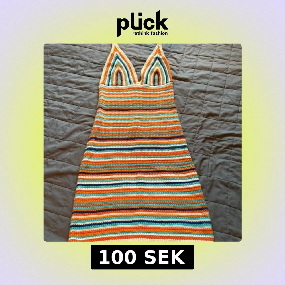 Färgglad virkad kortklänning från Ginatricot med smala axelband och djup v-ringning. Klänningen har ränder i orange, blått, turkost, vitt och beige. Perfekt för sommarens alla tillfällen och ger en riktigt retrovibe.