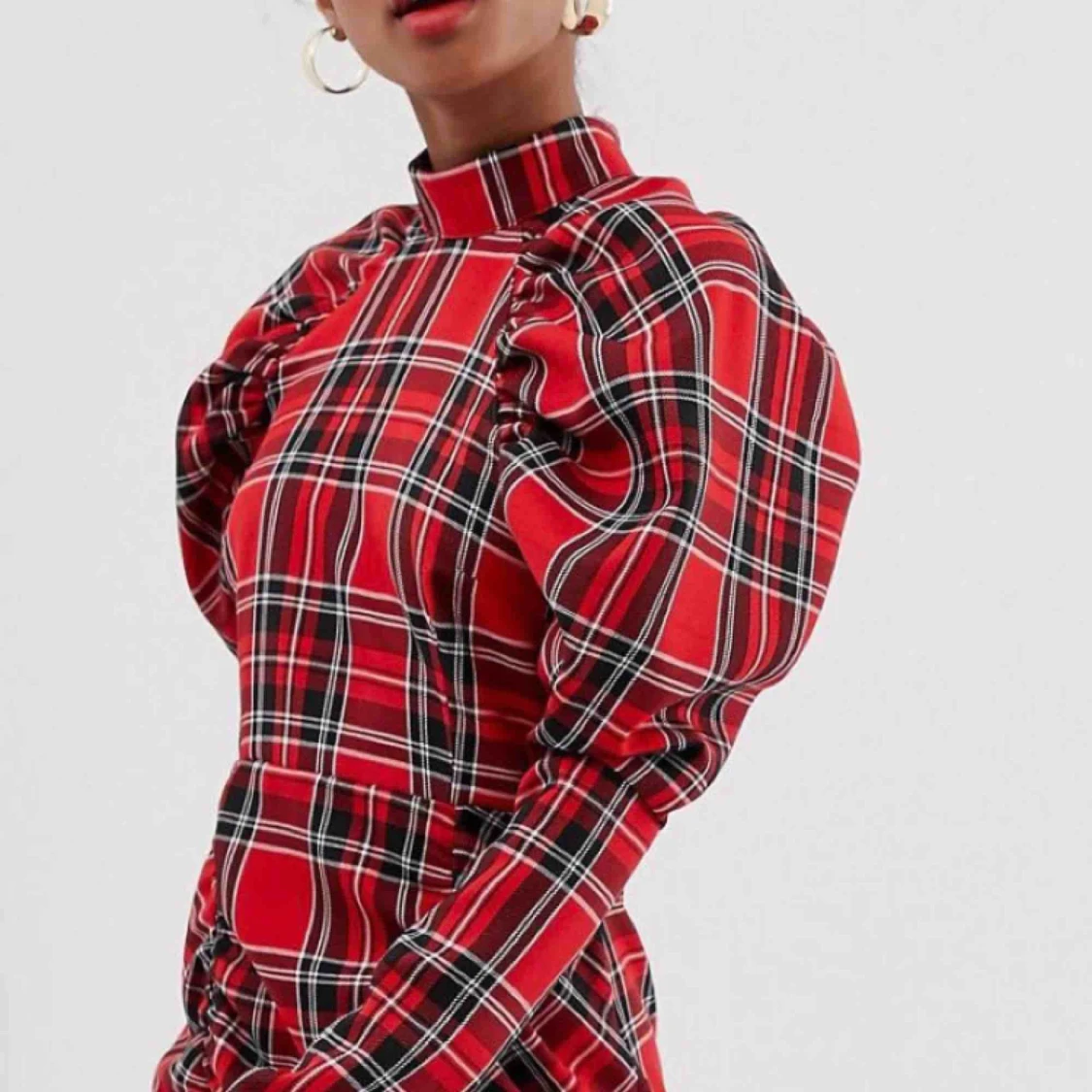 Rutig miniklänning med hög krage och puffärm. Använd bara en gång!