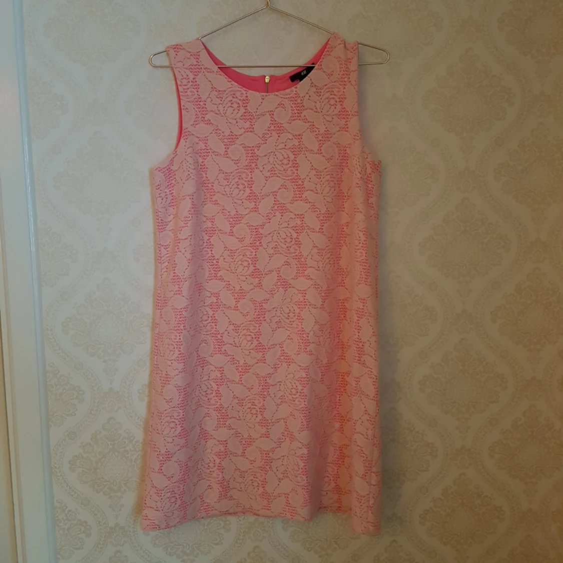 Äldre klänning från HM i 60-talsstil. Jättefint skick. Passar även M då det är en rak modell. Undertyget är rosa med vit spets utanpå. Dragkedja i nacken. Frakt ingår!
