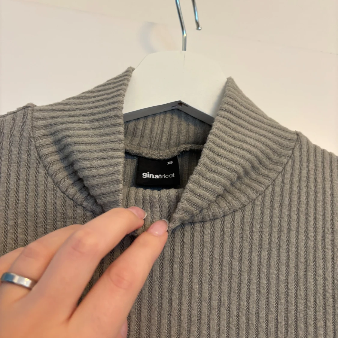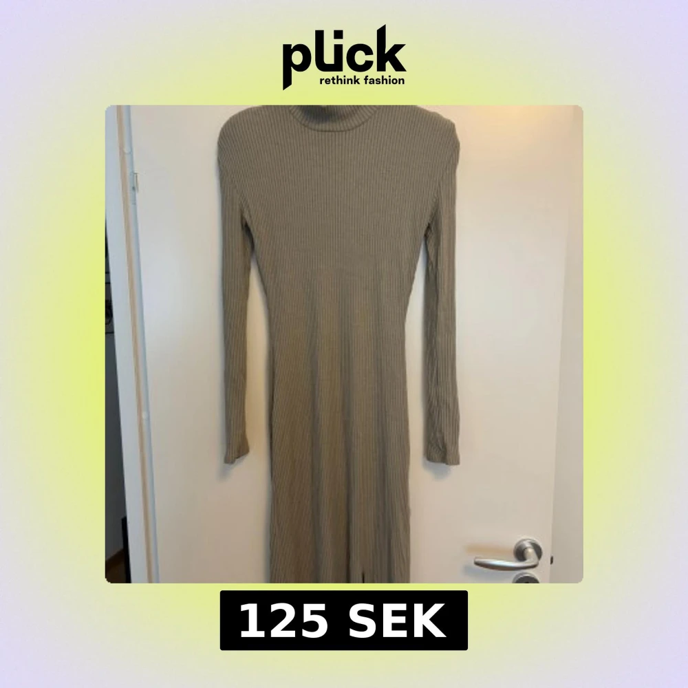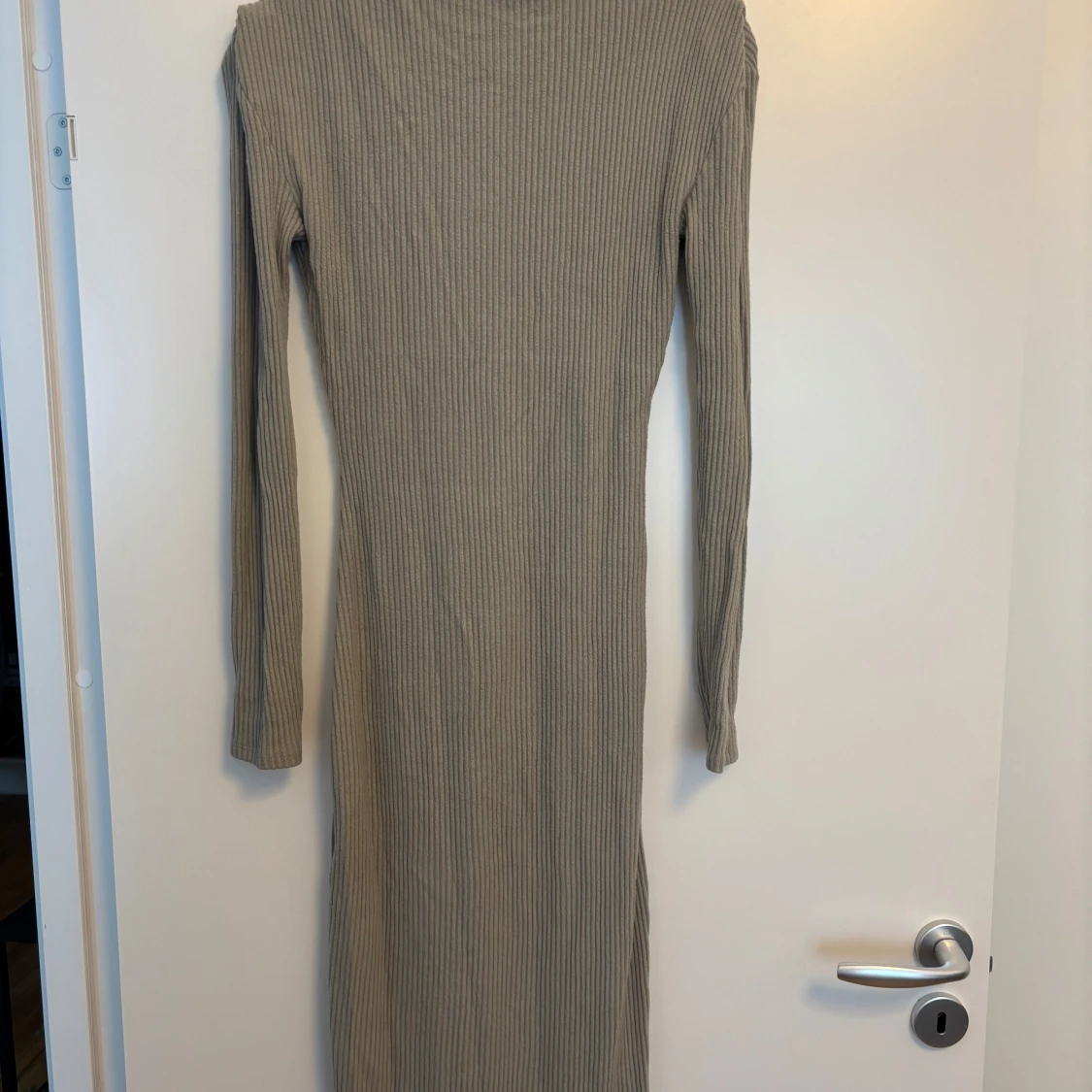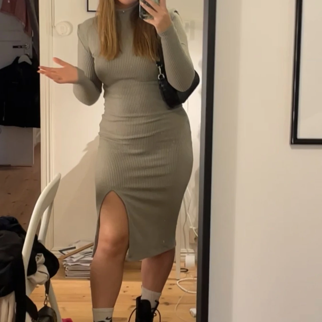 Supersnygg ribbad långklänning i beige/grön från Gina Tricot. Klänningen har lång ärm, hög hals och en slits framtill som ger en cool vibe. Figurnära passform och stretchigt material som sitter perfekt. Perfekt för dig som gillar stilrena och trendiga plagg.