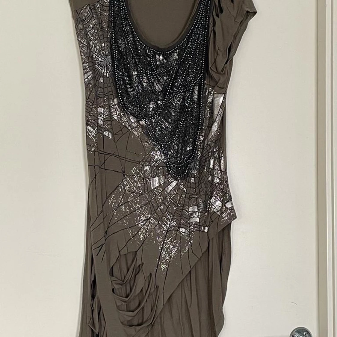 Använd en gång. Många mönster som silver spindelnät och svarta pärlor. Många hål. Brungrön. Köparen står för frakt.