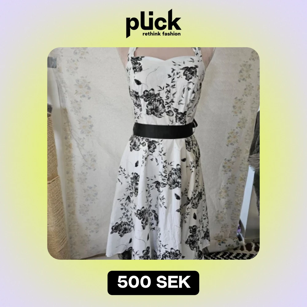 En elegant 50-tals inspirerad vit klänning med svart blommönster. Klänningen har en svart knytbälte i midjan och är axelbandslös med en dragkedja på baksidan. Materialet består av 65% bomull och 35% polyester.