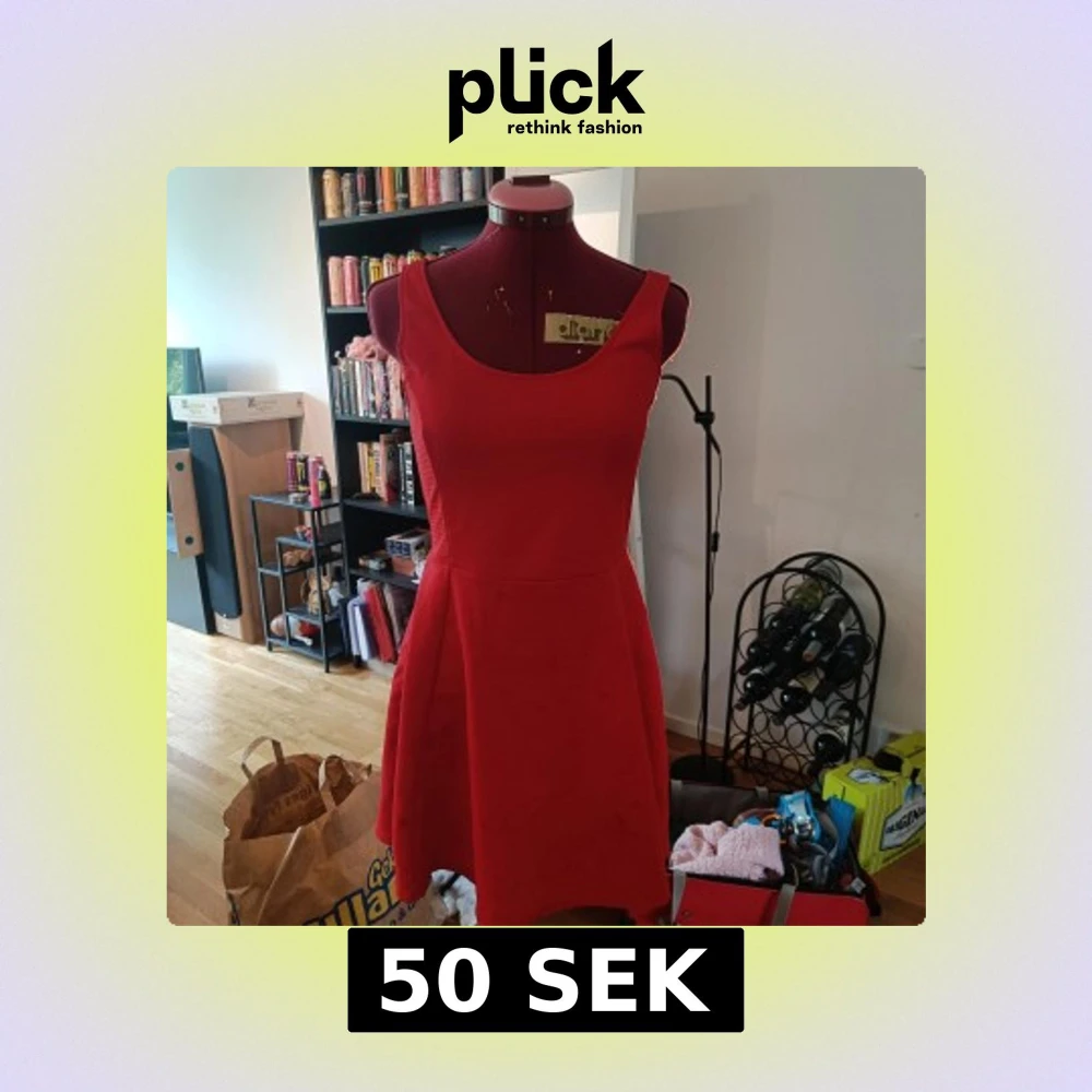 Snygg röd klänning med breda axelband och rundad urringning både fram och bak. Modellen är ärmlös och har en utställd kjol som ger en skön och ungdomlig siluett. Perfekt för dig som vill sticka ut med färg! Materialet känns mjukt och följsamt. Finns en liten fläck. Se bild!!