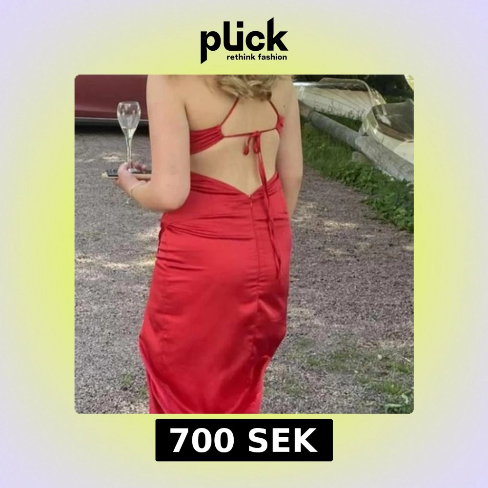 Elegant röd balklänning med öppen rygg och slits. Axelbandslös design med knytning i ryggen, perfekt för festliga tillfällen. Endast använd en gång på min egen bal 2023. Går att knyta på två olika sätt i ryggen. Säkert fler om man är lite kreativ.