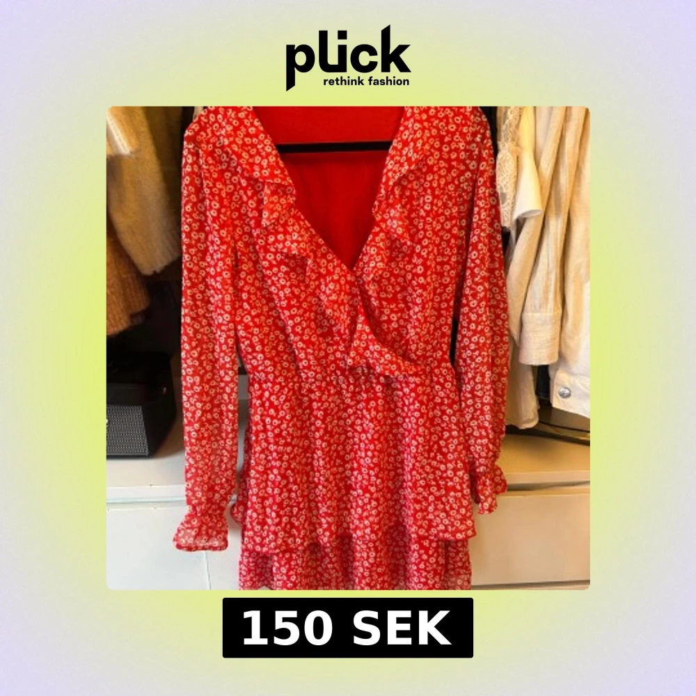 Säljer en röd blommig klänning från H&M Divided med volangdetaljer och omlott-design