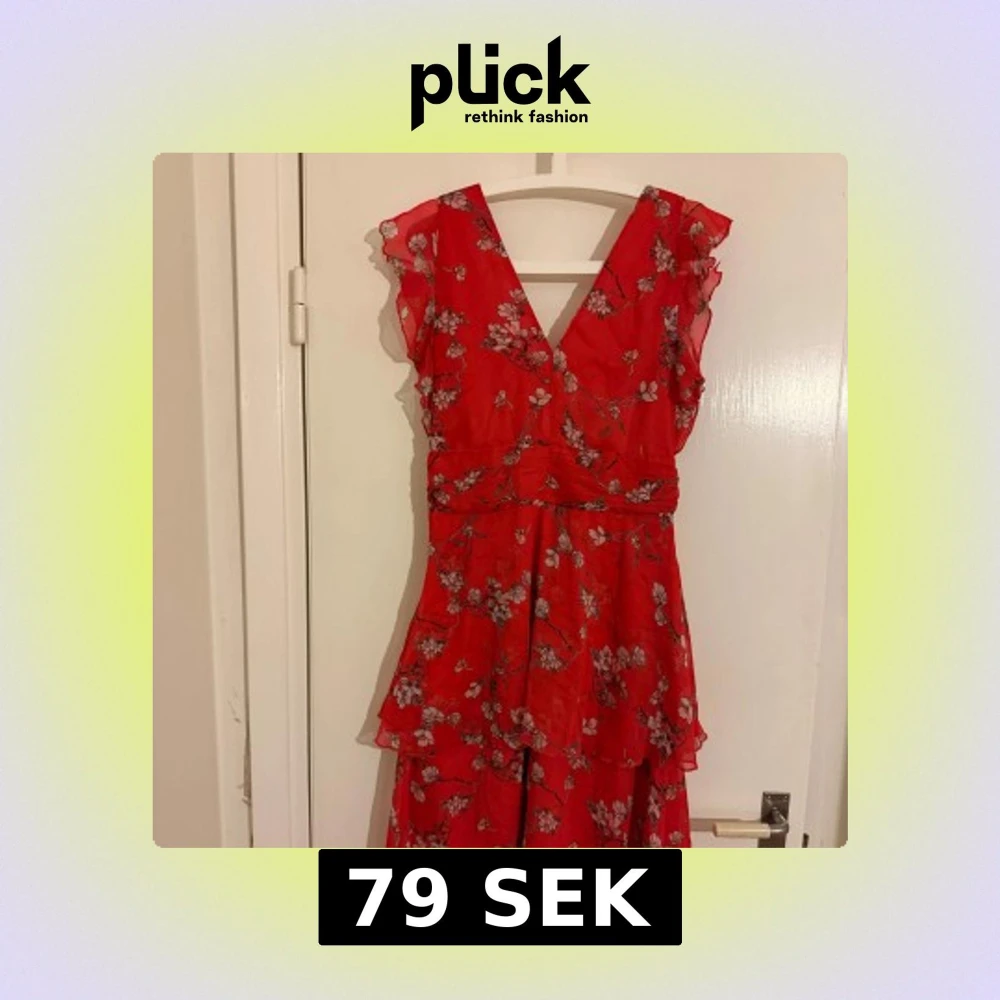 Snygg röd klänning med blommigt mönster och volangdetaljer. Den har en v-ringad hals och är ärmlös, vilket ger en elegant look. Perfekt för sommarens festligheter.