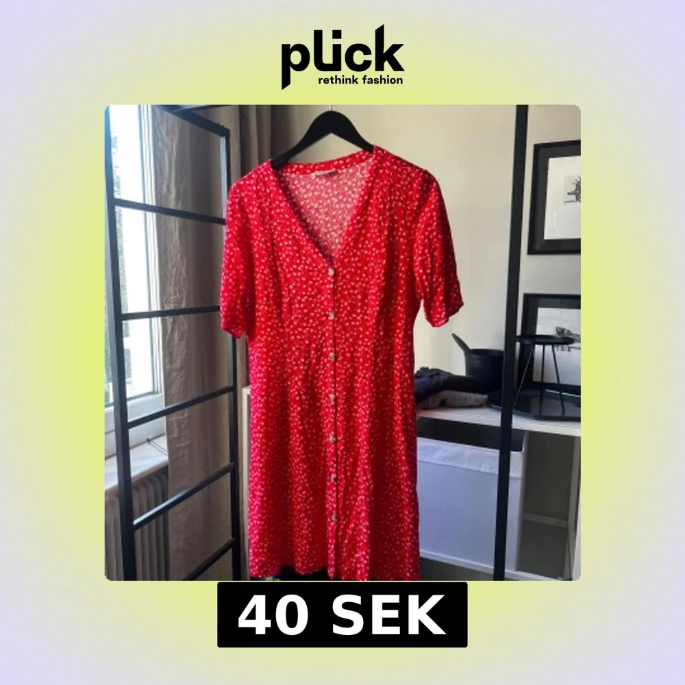 Superfin röd kortklänning från Monki med vita små blommor, v-ringning och knappar hela vägen framtill. Klänningen har korta ärmar och en lätt, flowy passform som känns både söt och chill. Perfekt för varma dagar när du vill sticka ut lite extra.