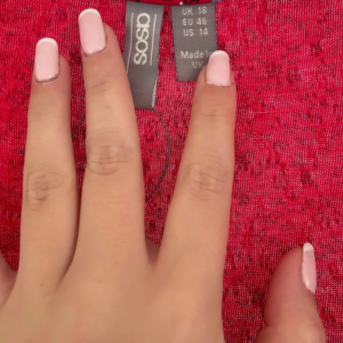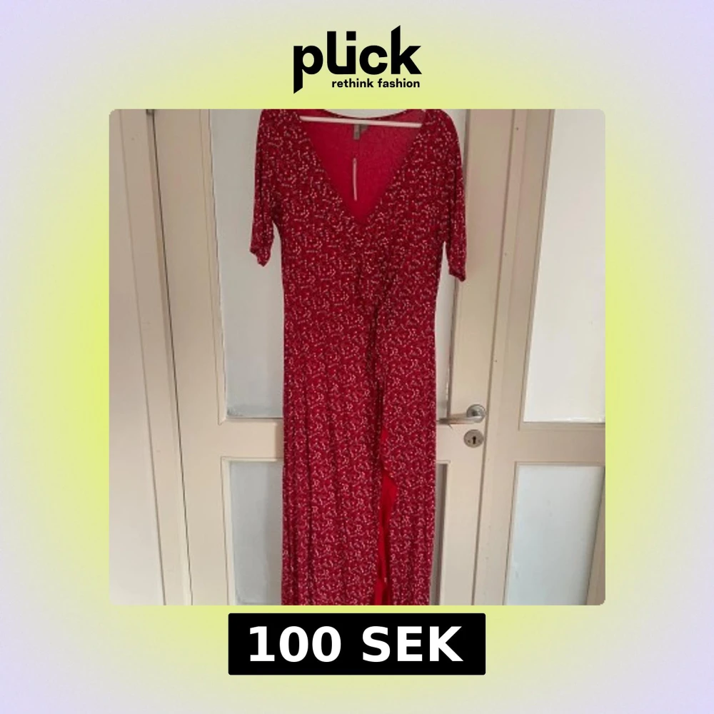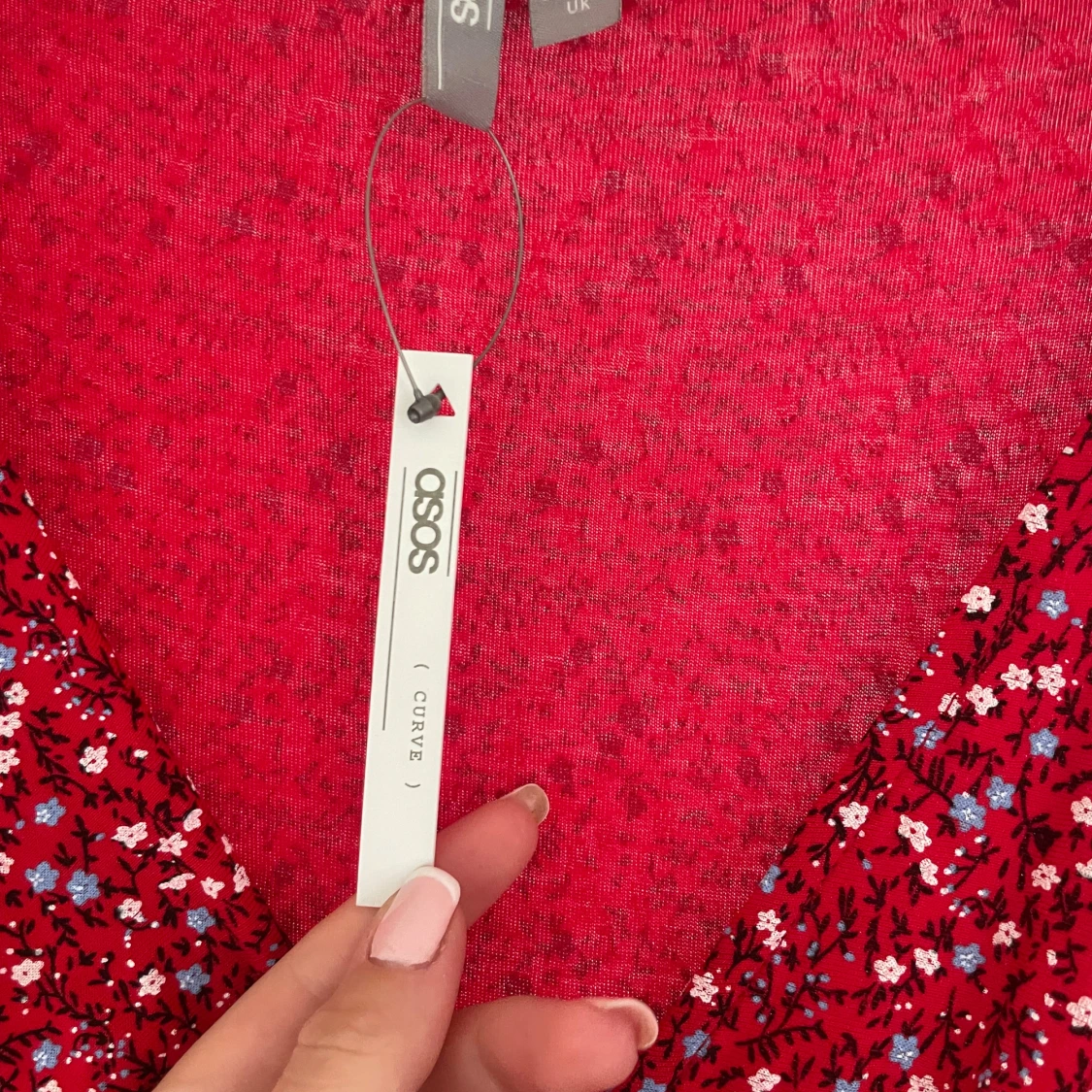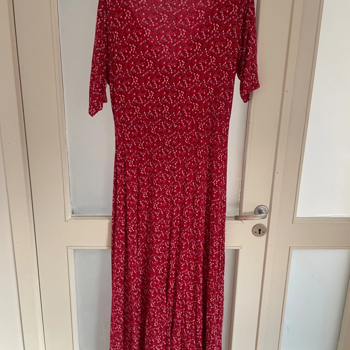 Säljer en röd långklänning från ASOS Curve med små blommor i vitt, blått och rosa. Klänningen har v-ringning, korta ärmar och en omlott-detalj framtill. Materialet är mjukt och följsamt, perfekt för dig som gillar färg och mönster.