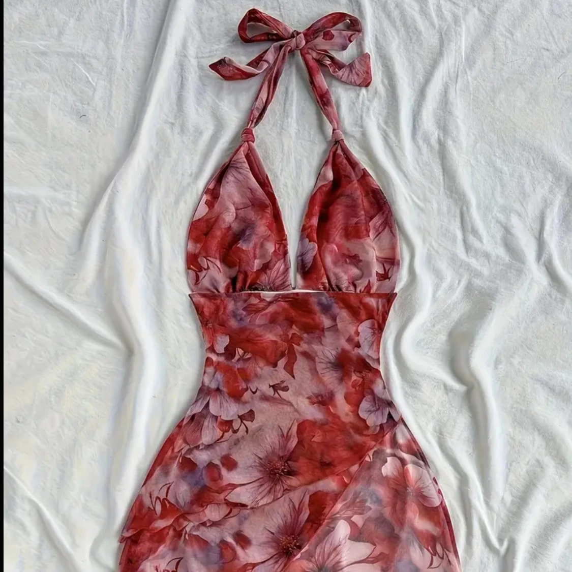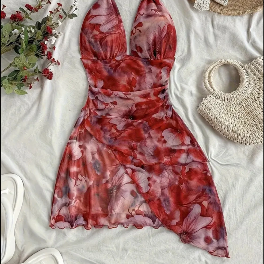 Passar xs-s. Supersöt kort klänning med röd och rosa blommigt mönster, djup v-ringning och halterneck med knyt i nacken. Omlott-design framtill och lätt, luftig känsla – perfekt för varma dagar.