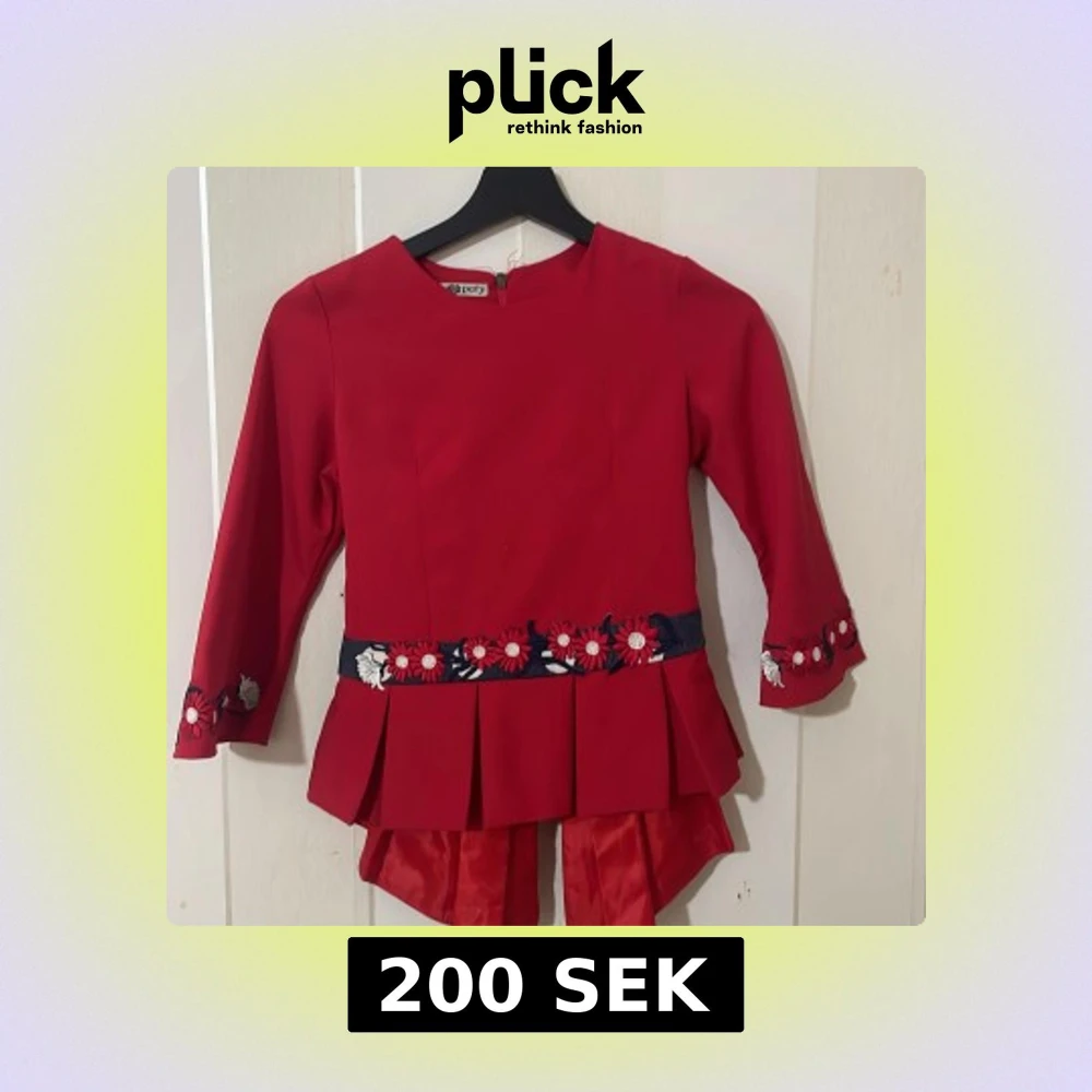 Charmig klänning i rött och blått med vita prickar. Överdelen är röd med blommiga broderier och volanger, medan kjolen är blå med vita prickar. Långärmad design med dragkedja bak och knytband i midjan.