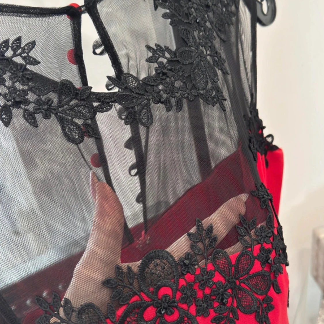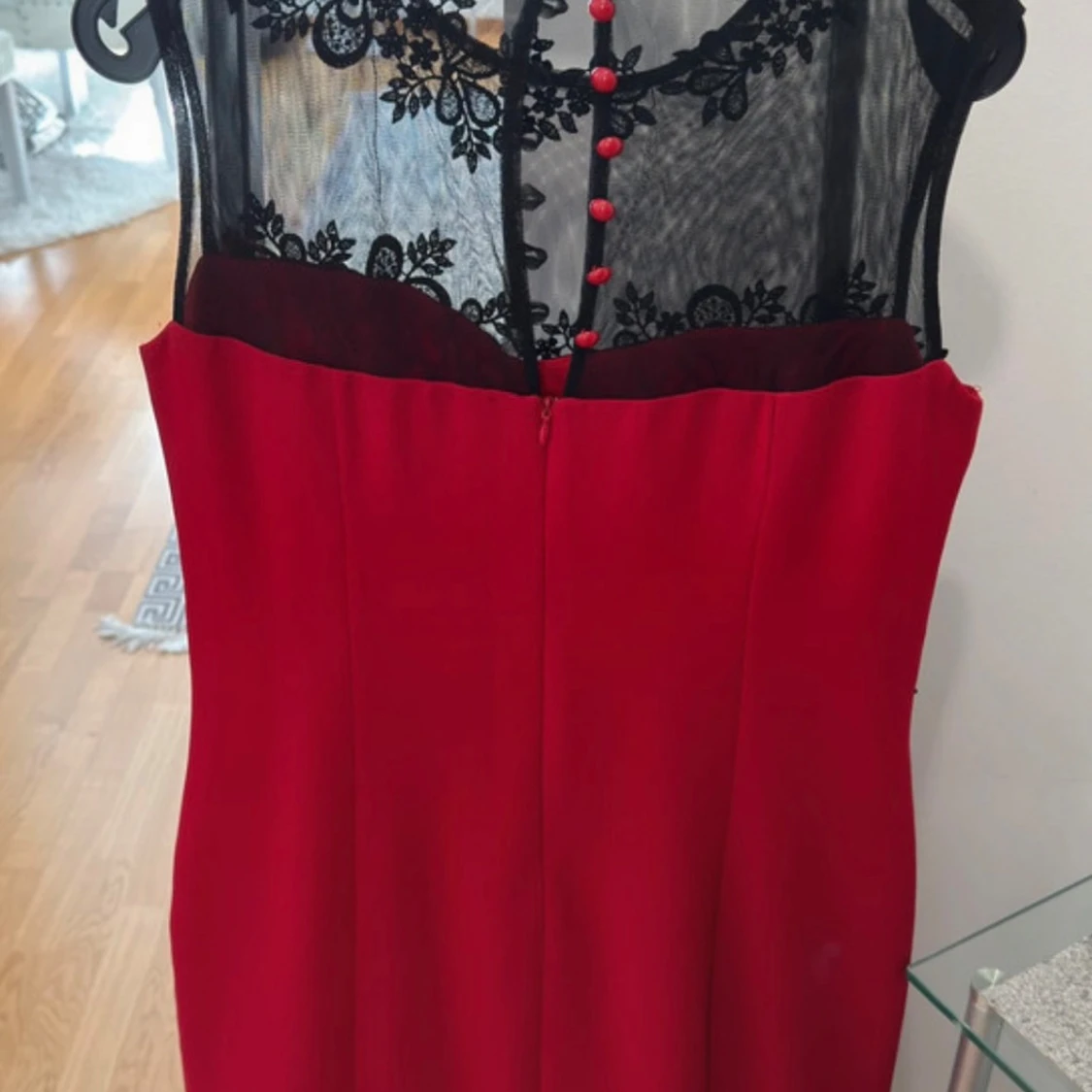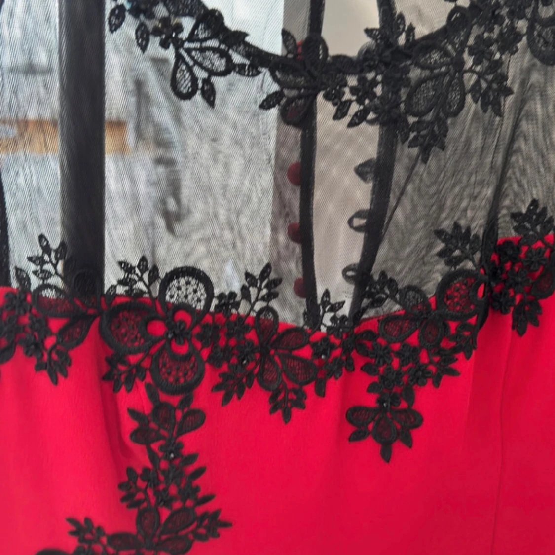 Säljer en elegant röd cocktail klänning med svart spetsdetalj upptill och längs ena sidayn. Klänningen har transparent mesh upptill med blommig spets och dekorativa knappar i ryggen. Perfekt för speciella tillfällen.
