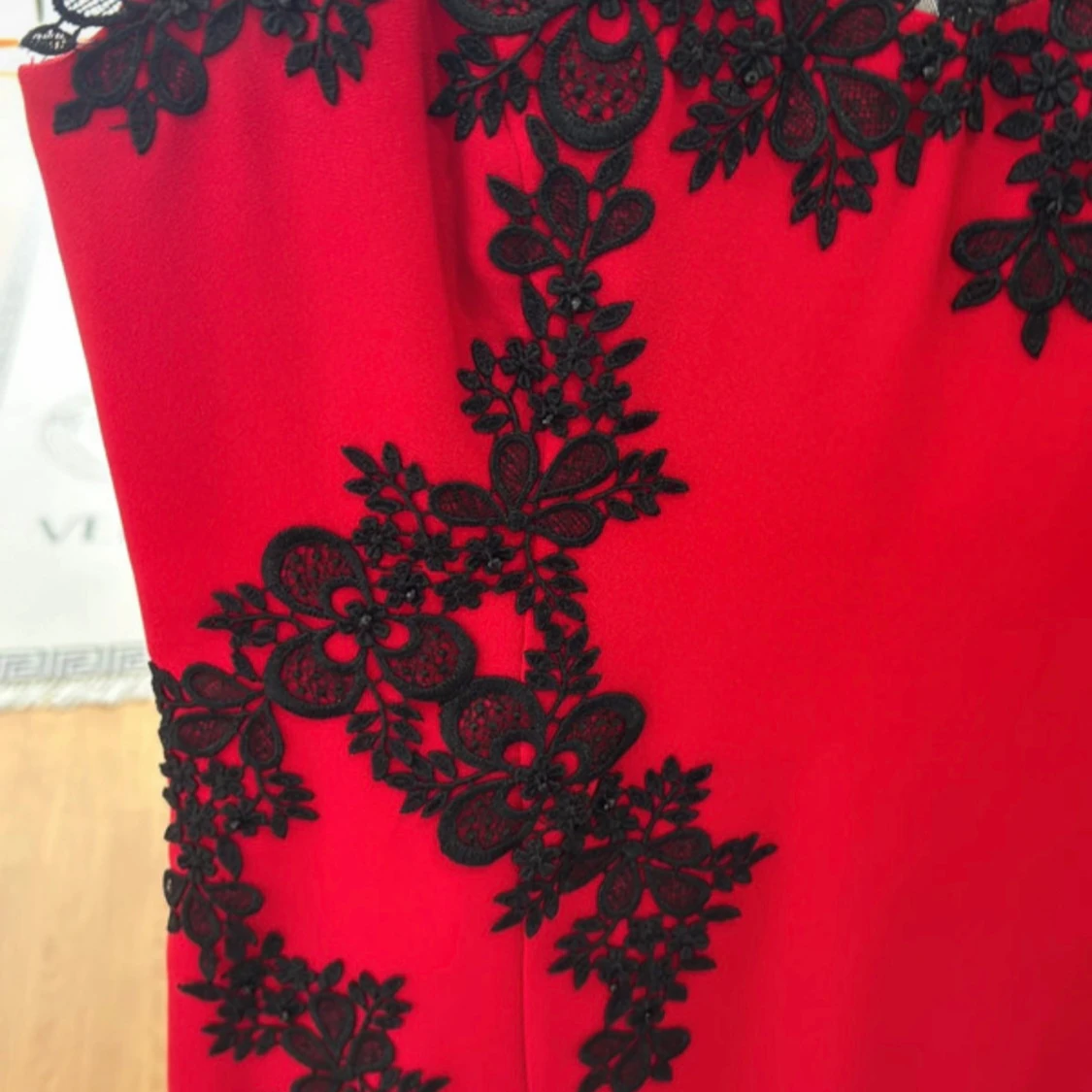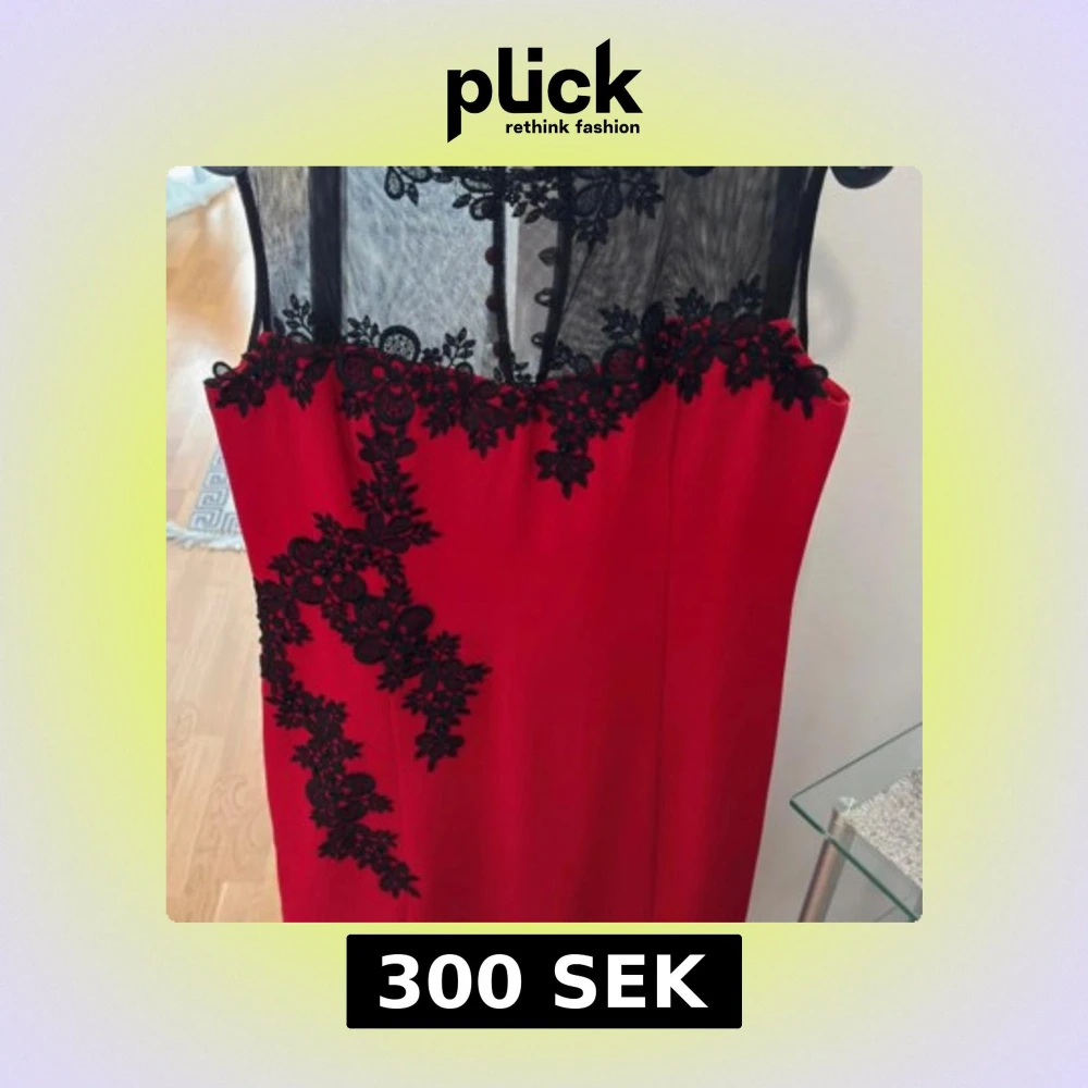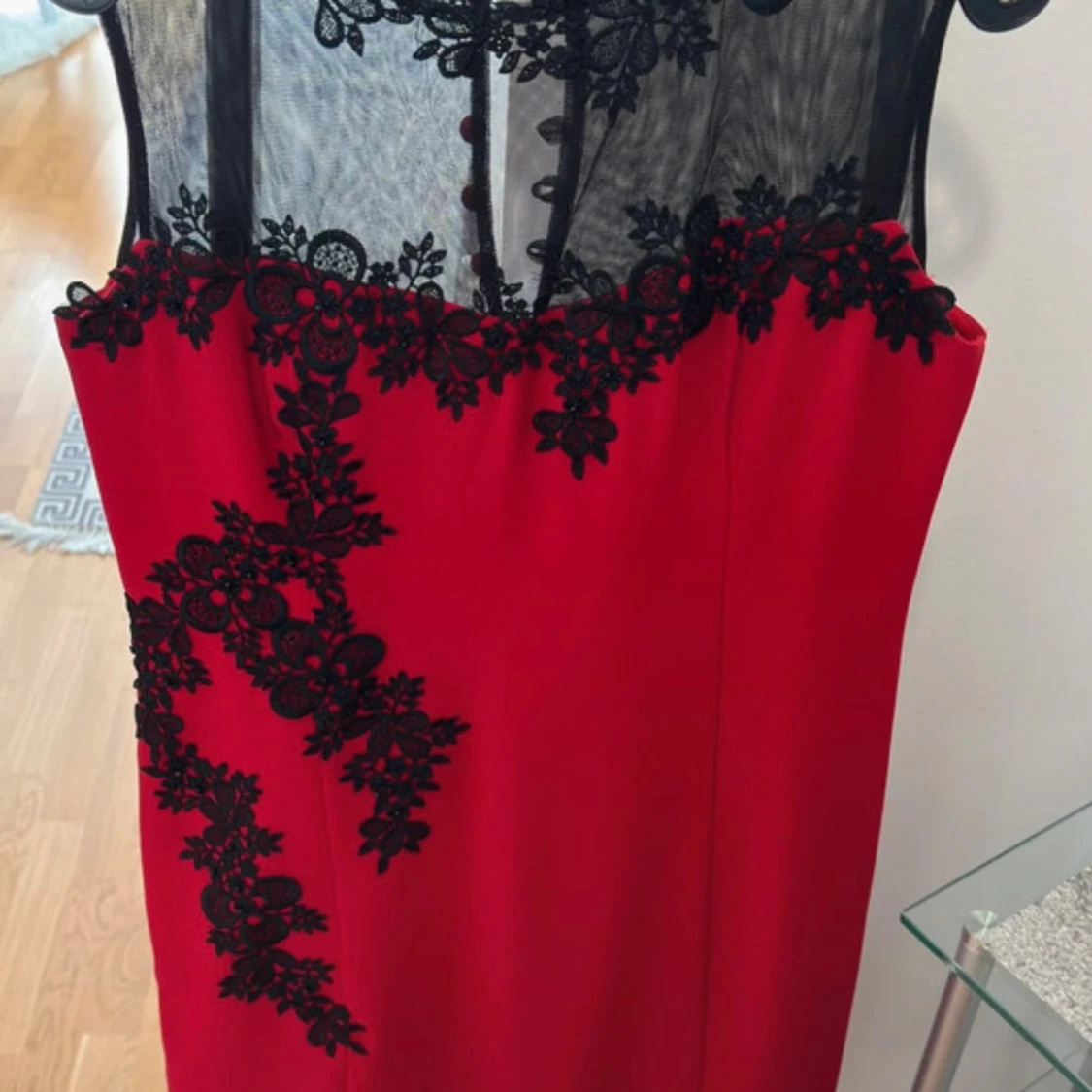 Säljer en elegant röd cocktail klänning med svart spetsdetalj upptill och längs ena sidayn. Klänningen har transparent mesh upptill med blommig spets och dekorativa knappar i ryggen. Perfekt för speciella tillfällen.