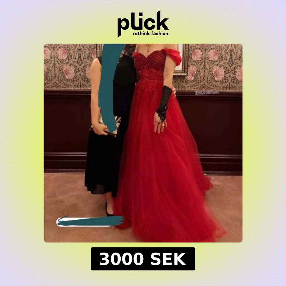 Säljer en fantastisk röd långklänning med glittrande paljetter och broderad spets upptill. Klänningen har omlott-snörning i ryggen och axelbandslös design med tyllkjol som ger en riktigt elegant look. Perfekt för bal eller nyår!