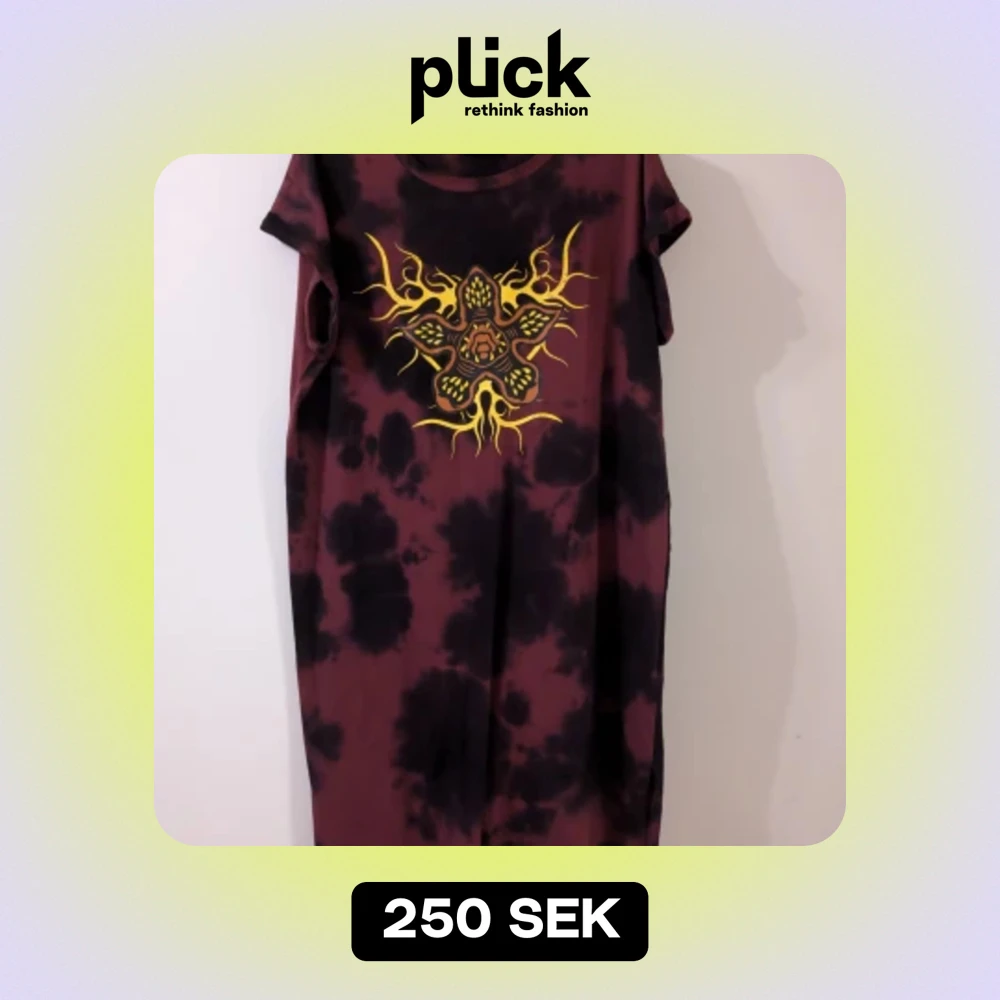 Säljer en supercool tie-dye klänning i mörkröd och svart med Stranger Things tryck på. Den har en avslappnad passform och är gjord i mjukt material. Korta slits längst ner. Världens skönaste men tyvärr så kommer den inte till användning. Storlek S men skulle nog passa M eller L också! Bara använd ett par gånger.
