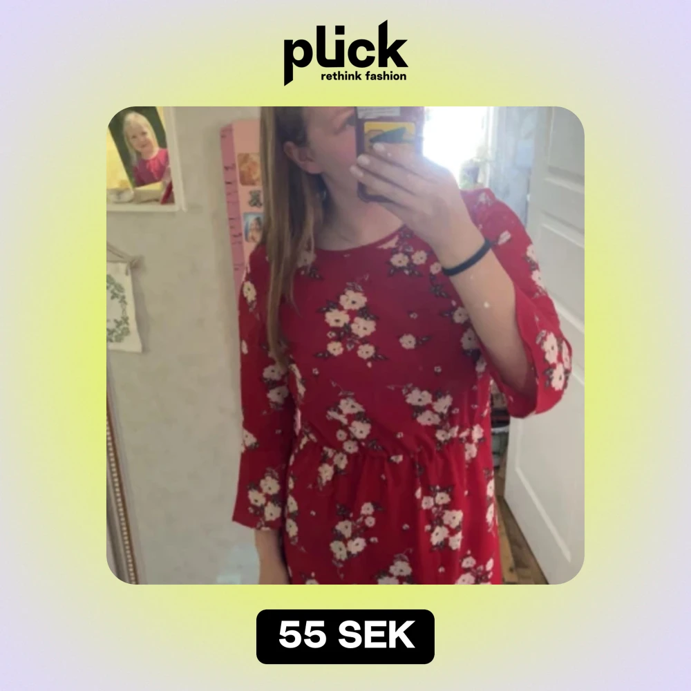 Röd klänning med vita blommor, från H&M i storlek 40. Använd om inga defekter eller fläckar, inte så stretchigt material, har trekvarts armar och är lite kortare än knälång. Skriv för mer info eller bilder! 💕