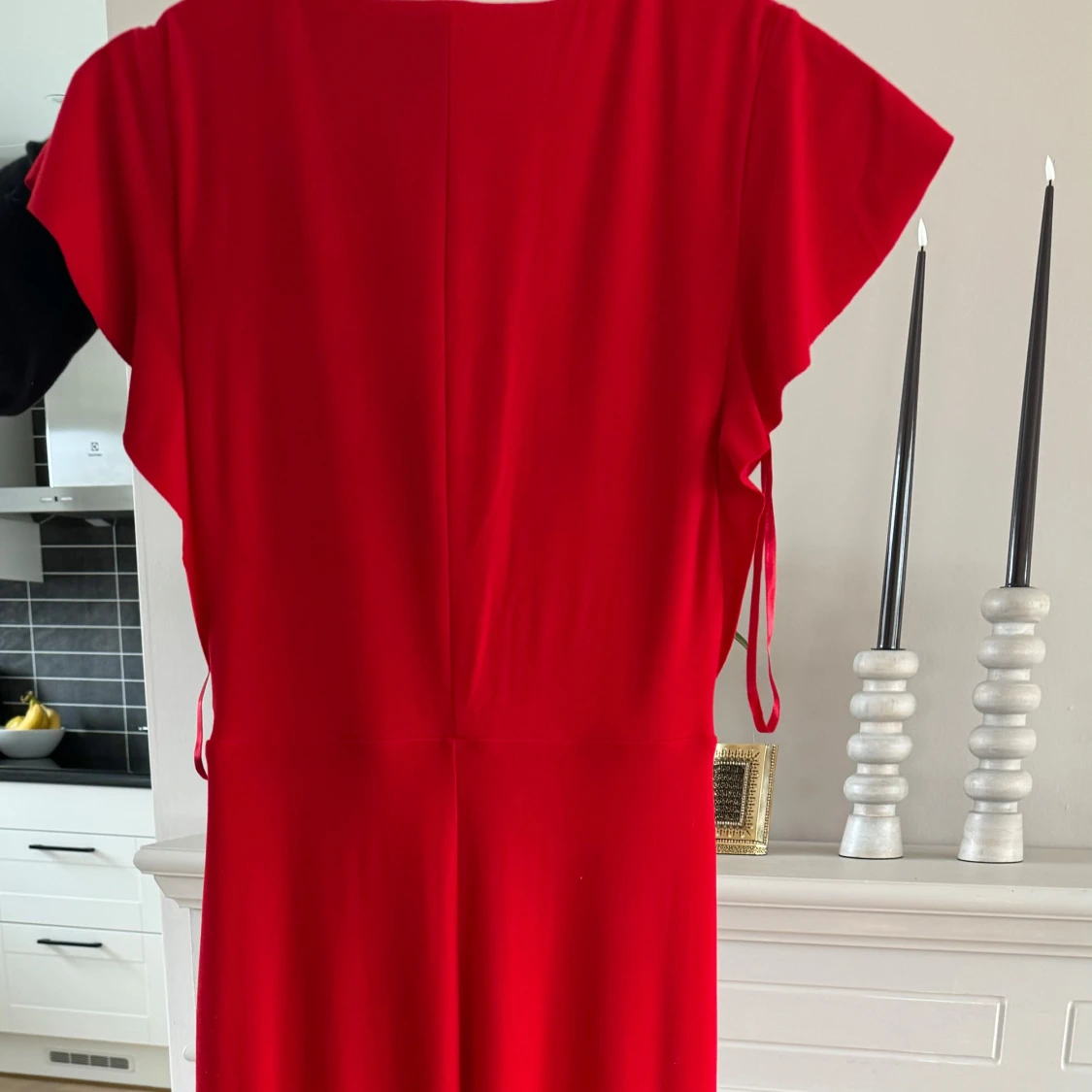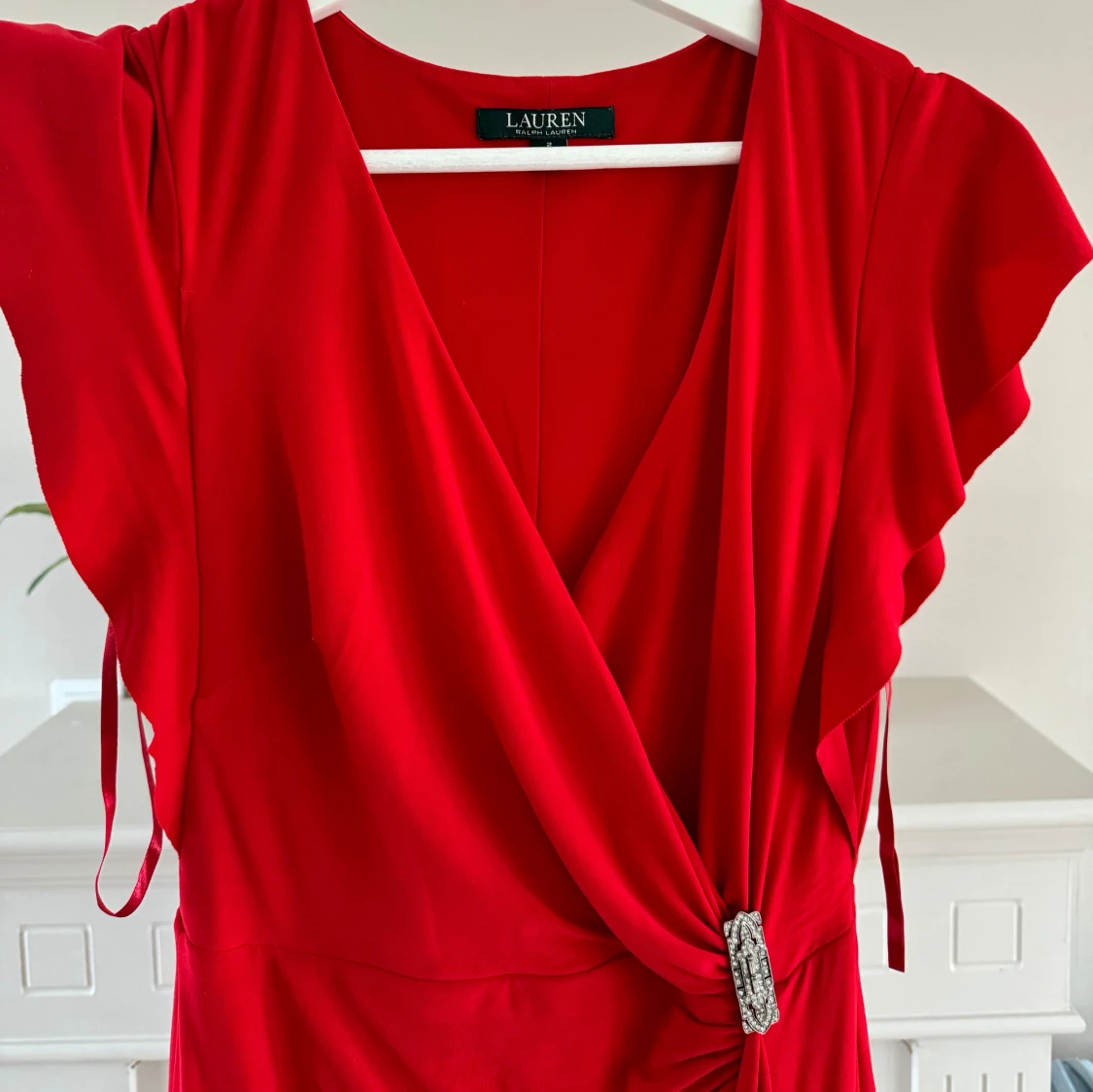 Priset kan diskuteras. Elegant röd klänning från Ralph Lauren med v-ringning och omlott-design. Klänningen har en dekorativ detalj i midjan och korta ärmar. Perfekt för en festlig kväll! Den är lång, men appen fick inte med hela bilden, har fler bilder ifall det önskas. Perfekt också nu till balen ifall man har det! Bara en gång användning i några timmar annars helt orörd!