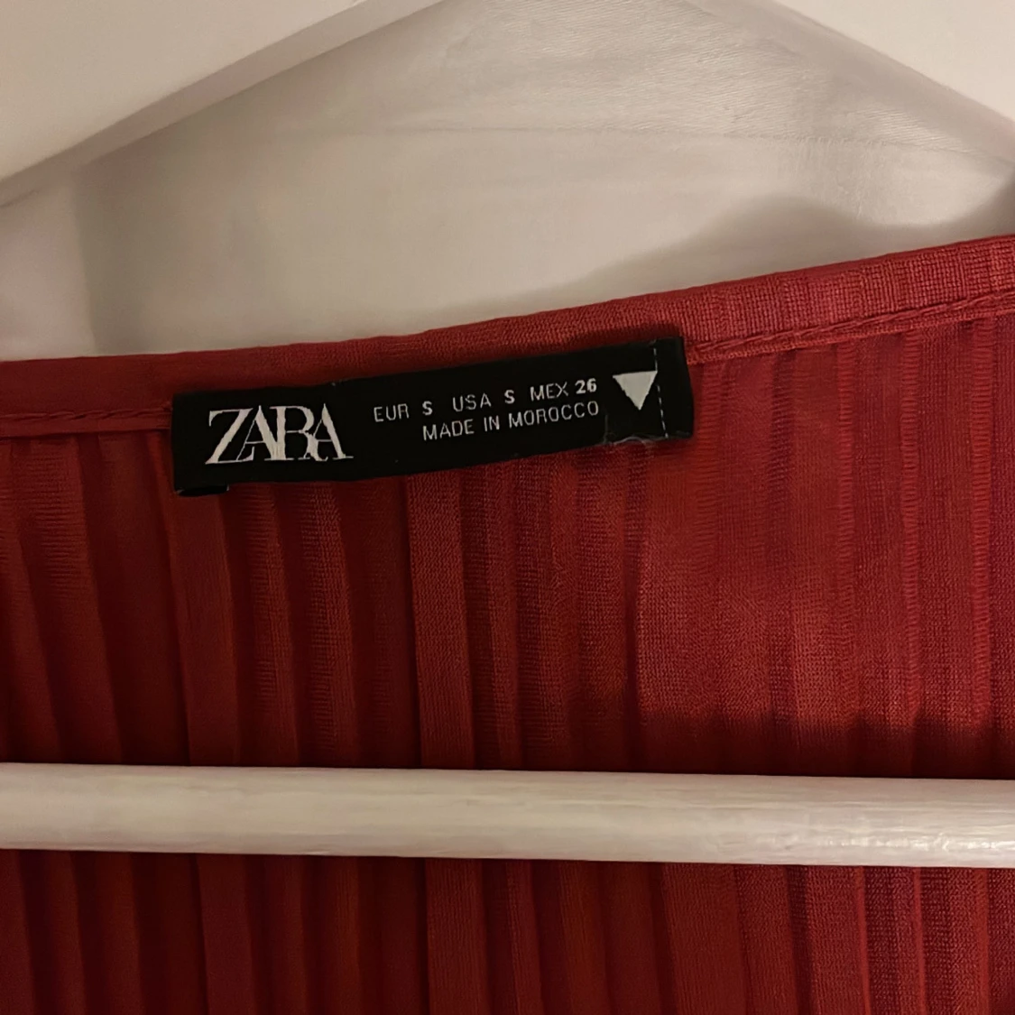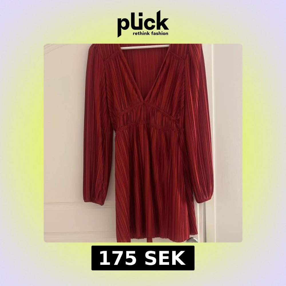 Snygg röd klänning från Zara med v-ringning och långa ärmar. Den har ett plisserat mönster som ger en elegant touch. Perfekt för höst och vinter💕