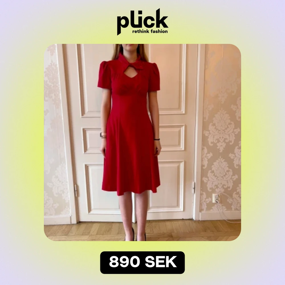 Röd klänning i bekvämt material. Storlek 38. Hög krage och puffiga ärmar. Modellen på bilden är 173 cm och har storlek 38 i de flesta andra kläder. Aldrig använd. Vi har lagt ner vår klänningsbutik och säljer ut. Ny pris är 2000-3000kr