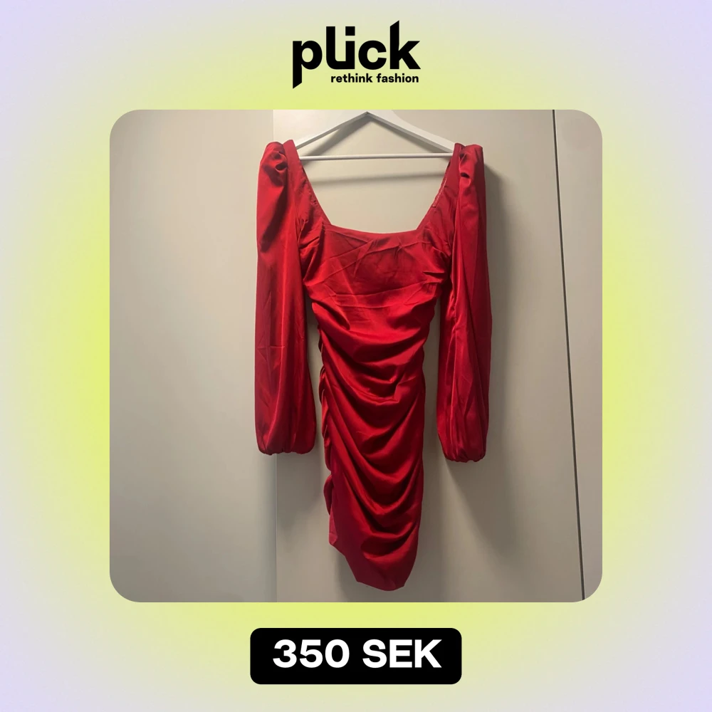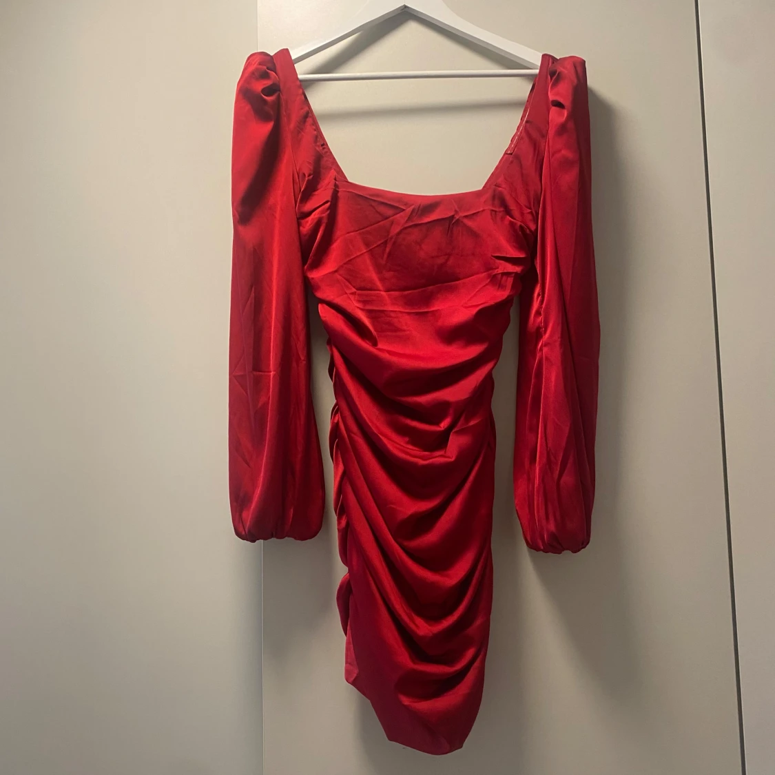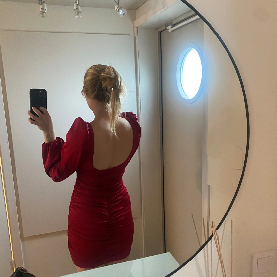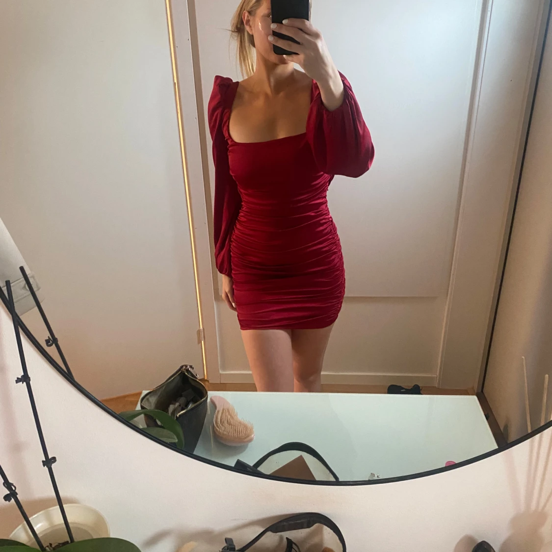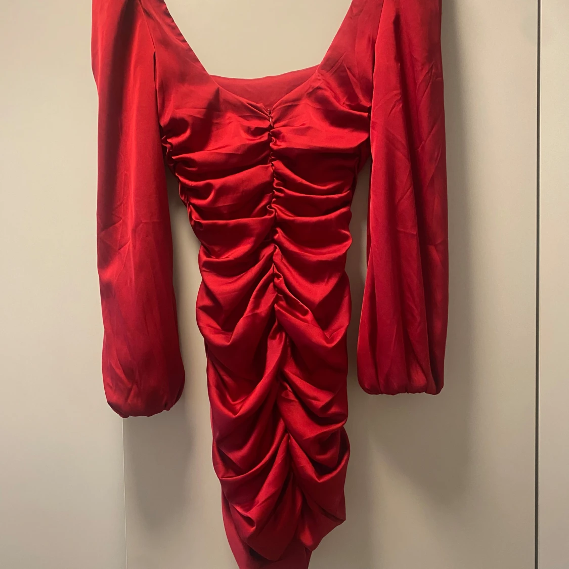 Säljer en superfin röd klänning med långa ärmar och rynkdetaljer framtill. Den har en tight passform och är perfekt för festliga tillfällen. Klänningen är kort och har en djup urringning som ger en elegant look. Materialet ser ut att vara glansigt, vilket ger en lyxig känsla. Använd endast 1 gång