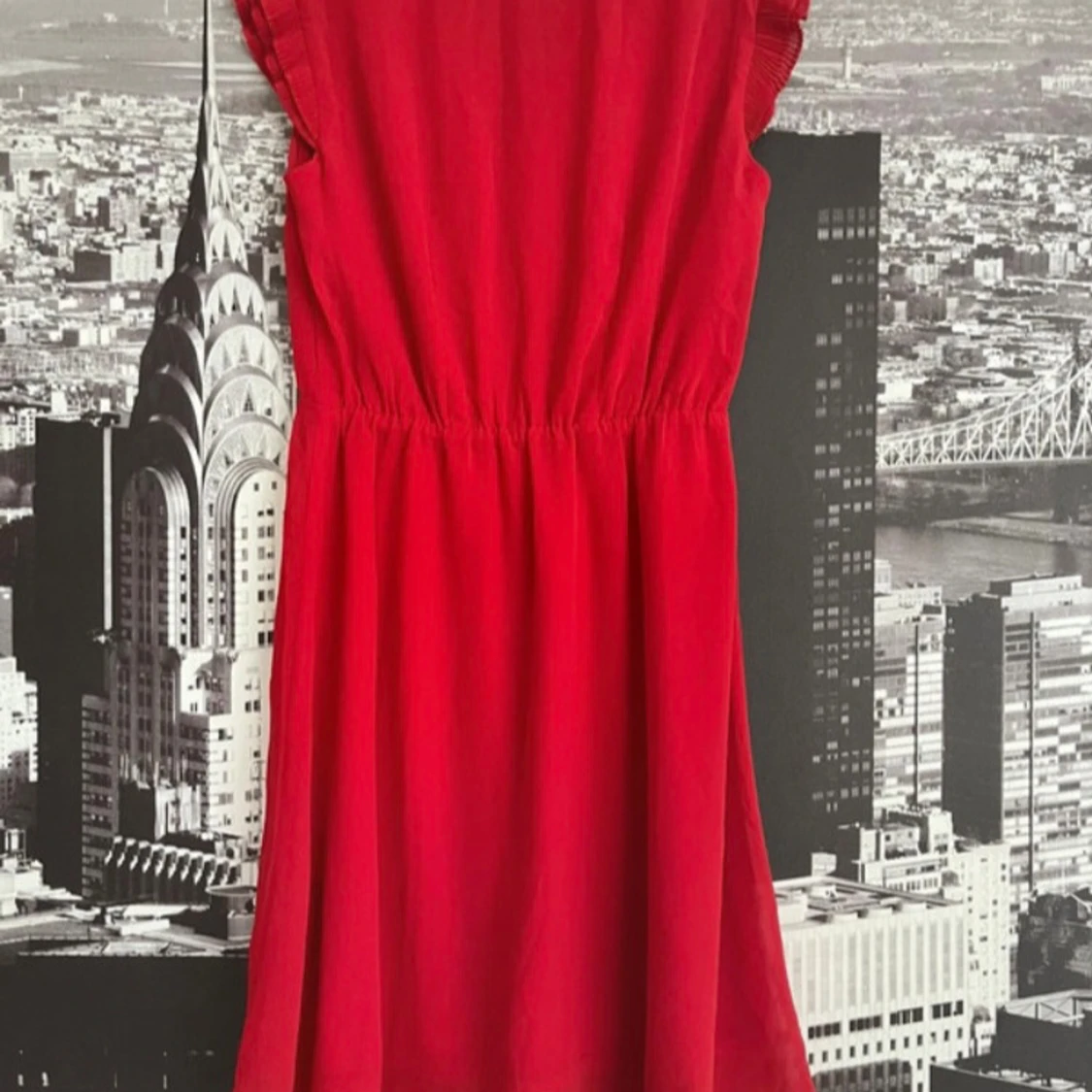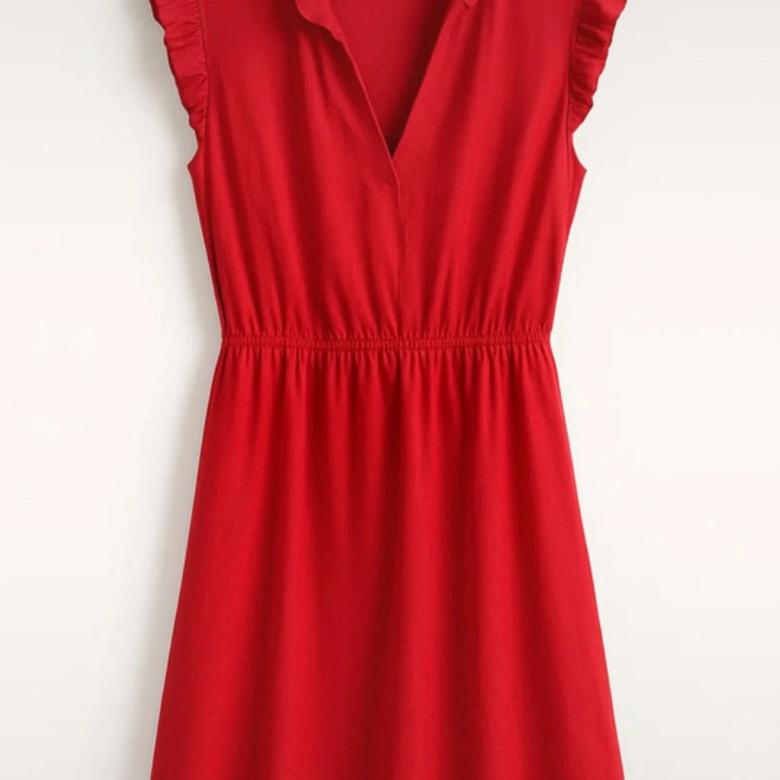 Supersöt röd klänning från H&M med volangdetaljer vid ärmhålen och markerad midja. Klänningen är ärmlös, har v-ringning och är i en mjuk, lätt bomullskvalitet. Perfekt för dig som vill ha en enkel men snygg look.