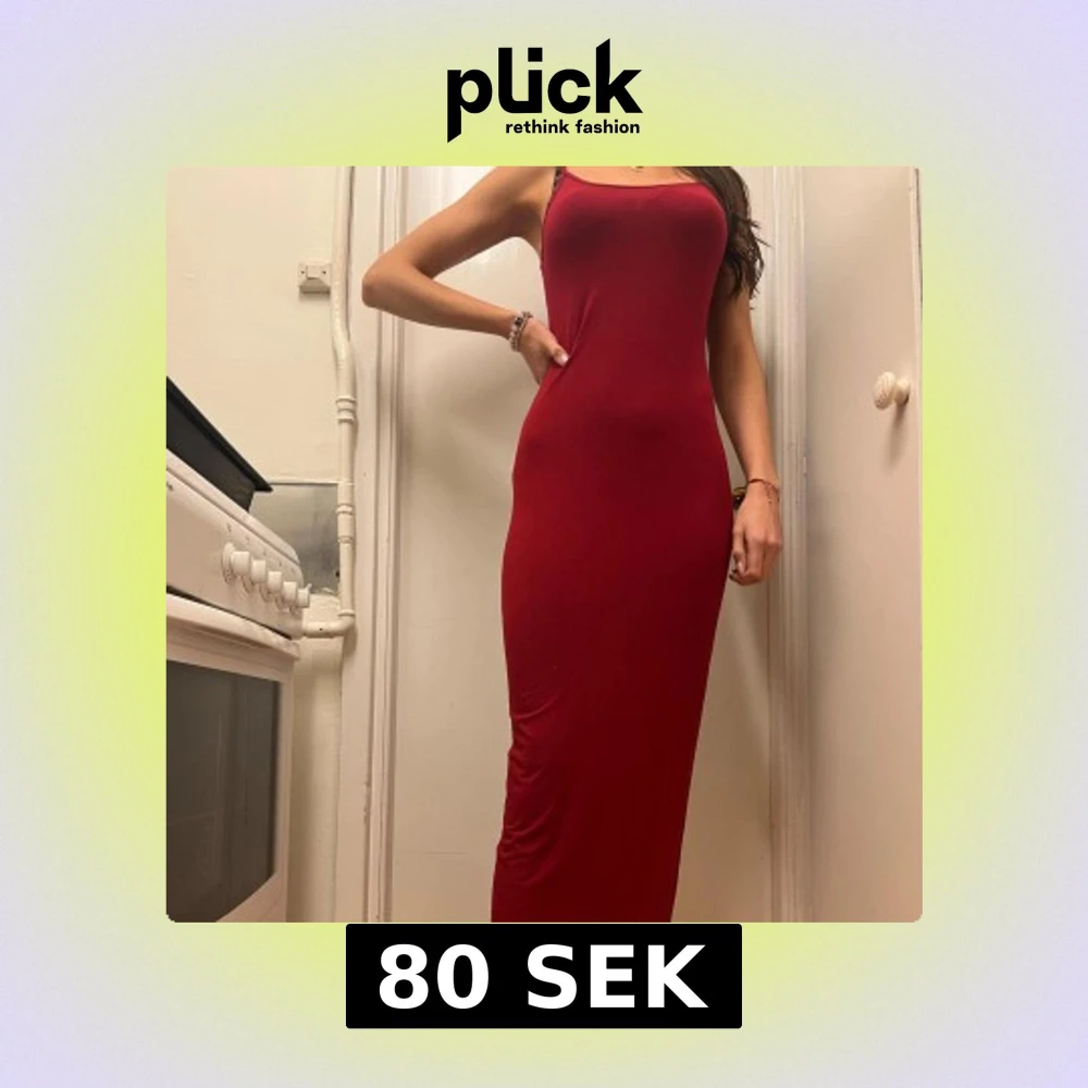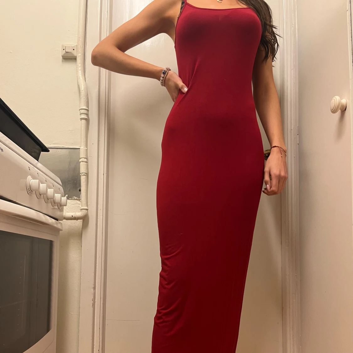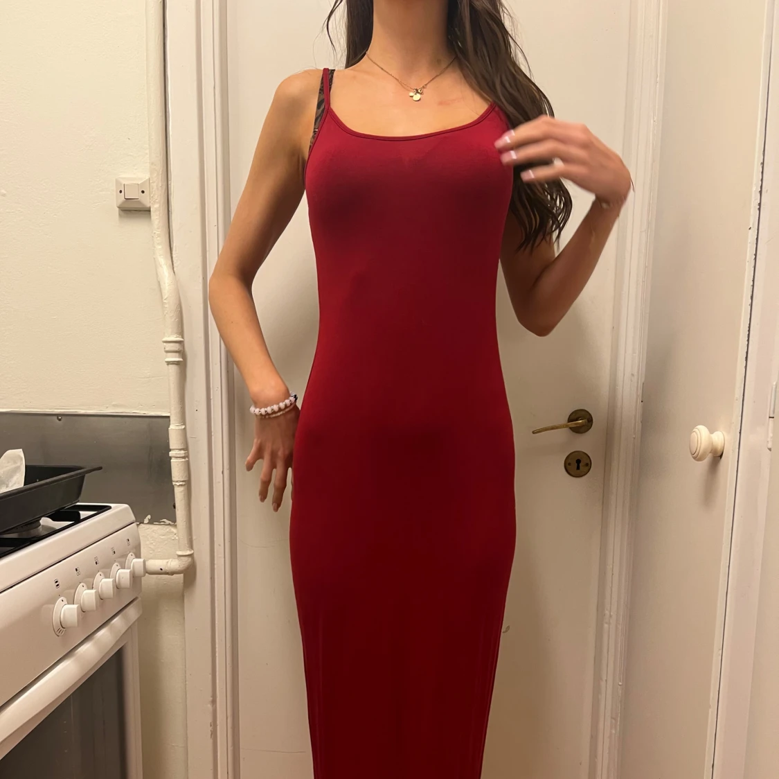 Säljer en snygg röd långklänning med smala axelband och figurnära passform. Mjuk och stretchig bomullskvalitet som känns skön mot huden. Passar till allt💖 Fraktar/Möts upp i Solna! Kolla min profil för mer kläder, paketpris gäller! ⭐️