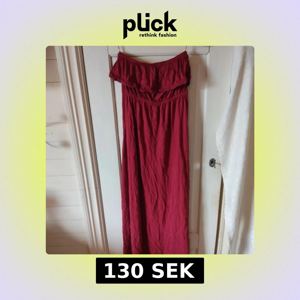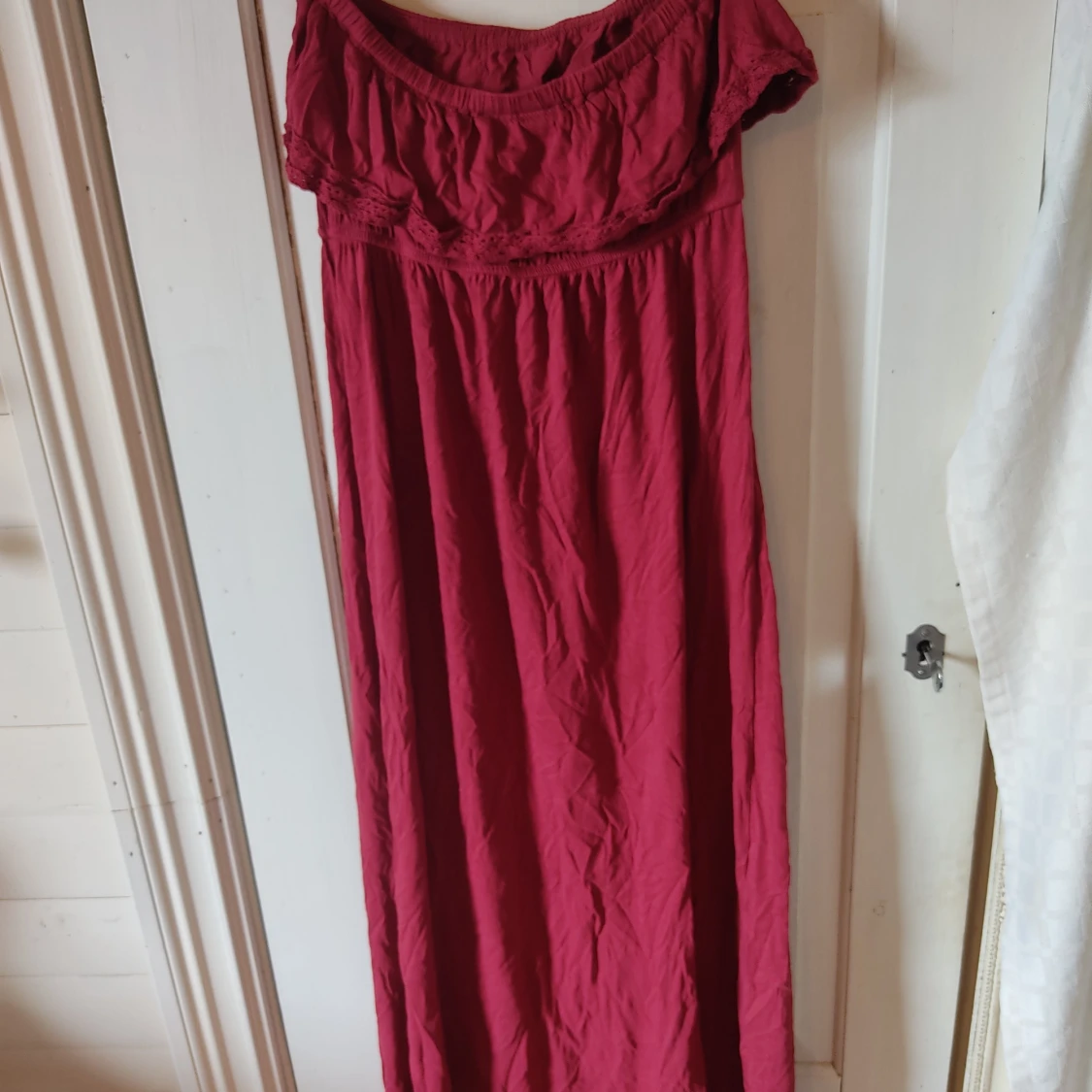 En lång mörkröd strapless klänning med en en volang runt hela kanten. Den har en resår både över och under bysten så att den inte ska åka ner. Det ena bandet som man använder för att hänga upp klänningen på galgen håller på att gå av men det påverkar inte hur den ser ut på kroppen.