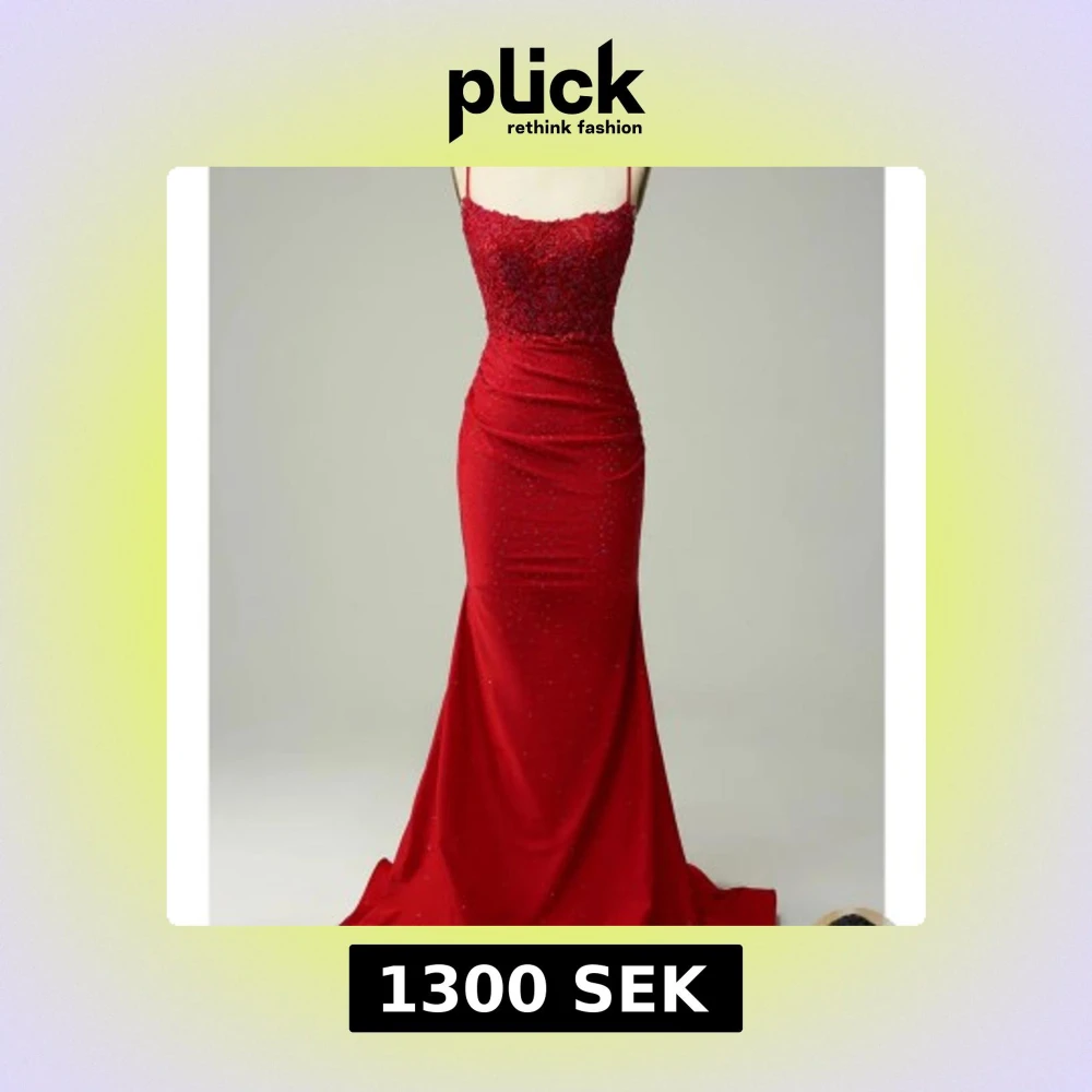 Säljer en elegant röd långklänning med smala axelband, spetsdetaljer upptill och glittriga stenar över hela klänningen. Klänningen har figurnära passform och öppen rygg med korsade band, sitter som en smäck på kroppen. Perfekt för bal eller fest.