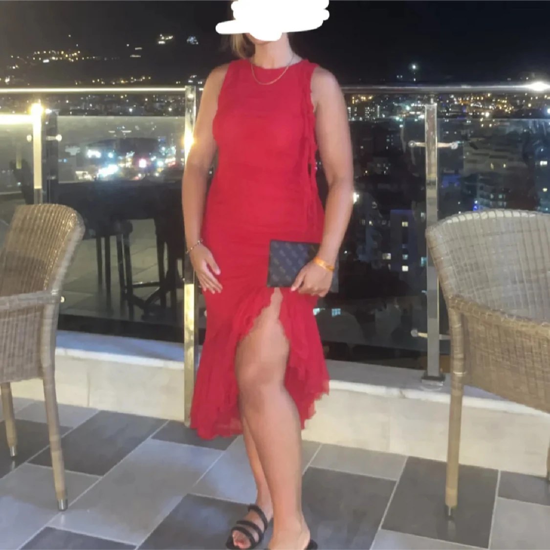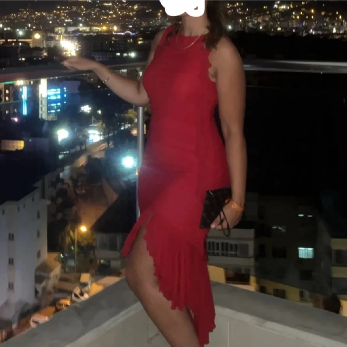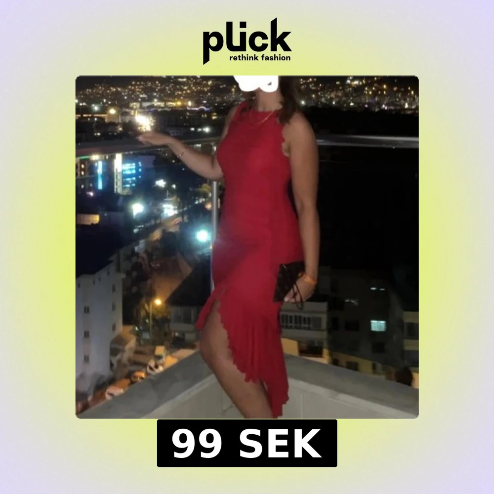 Snygg röd långklänning med ärmlös design och rund halsringning. Klänningen har en markerad slits framtill och volangdetaljer längs nederkanten, vilket ger en extra touch. Perfekt för dig som vill sticka ut med en elegant och trendig look.