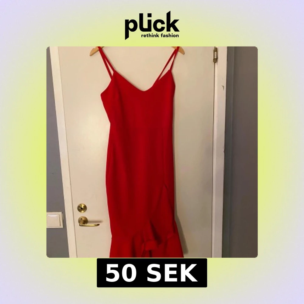 Snygg röd långklänning med smala axelband och v-ringad hals. Klänningen har en figurnära passform och en volangdetalj nedtill som ger extra flärd. Materialet är slätt och känns mjukt mot huden. Perfekt för dig som vill sticka ut med en färgstark look.Frakt igår inte ❤️