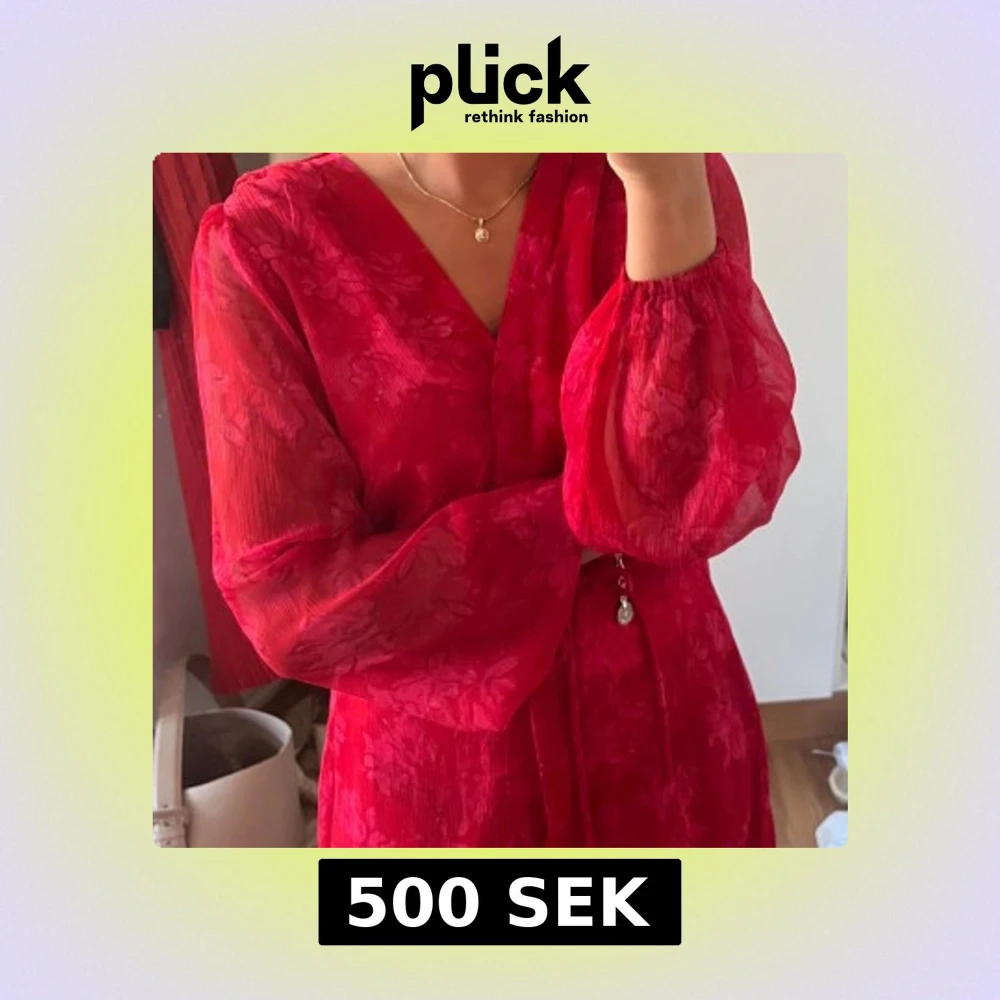 Säljer en röd långklänning med blommigt mönster och v-ringning. Klänningen har långa, transparenta ärmar och ett knytband i midjan för en snygg passform. Perfekt för dig som vill sticka ut med färg och stil.
