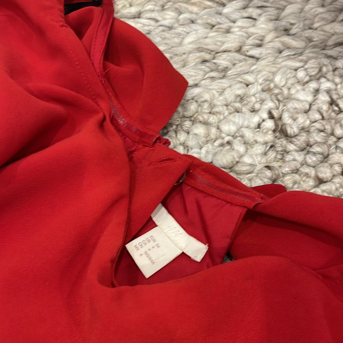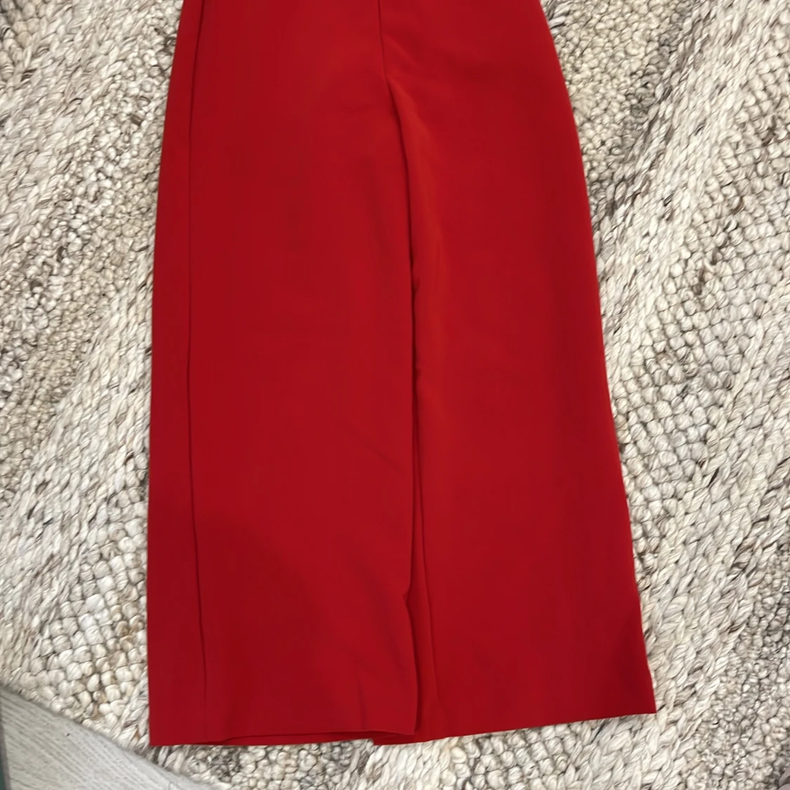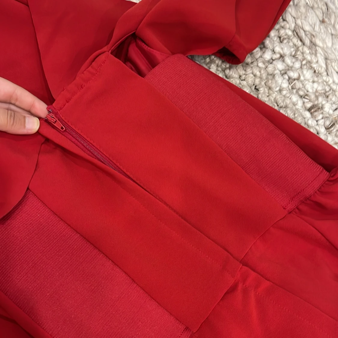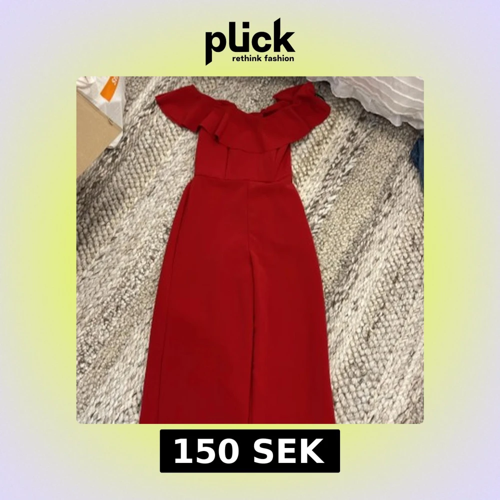 Snygg röd jumpsuit från H&M med offshoulder och volang upptill. Har en figurnära passform och dragkedja i ryggen för enkel påklädning.