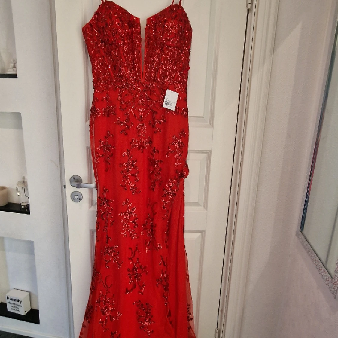 Säljer denna fina röda balklänning då den är lite för liten och har hittat en annan. Aldrig använd bara testad. Paljetter i mönster på hela klänningen, storlek 42 men snörning i ryggen så den går att justera lite.